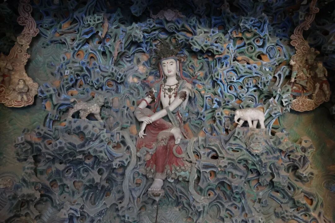 整壁悬塑内容丰富,有峰峦千重,祥云缭绕,有罗汉护法,天神巡礼,观世音菩萨踏莲之意表示脚踏西方净土世界。