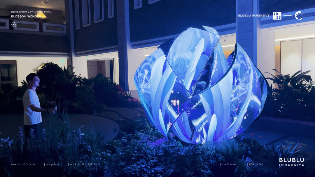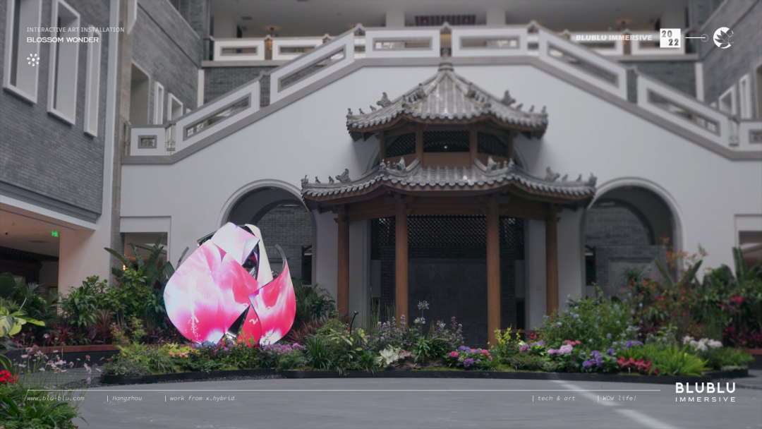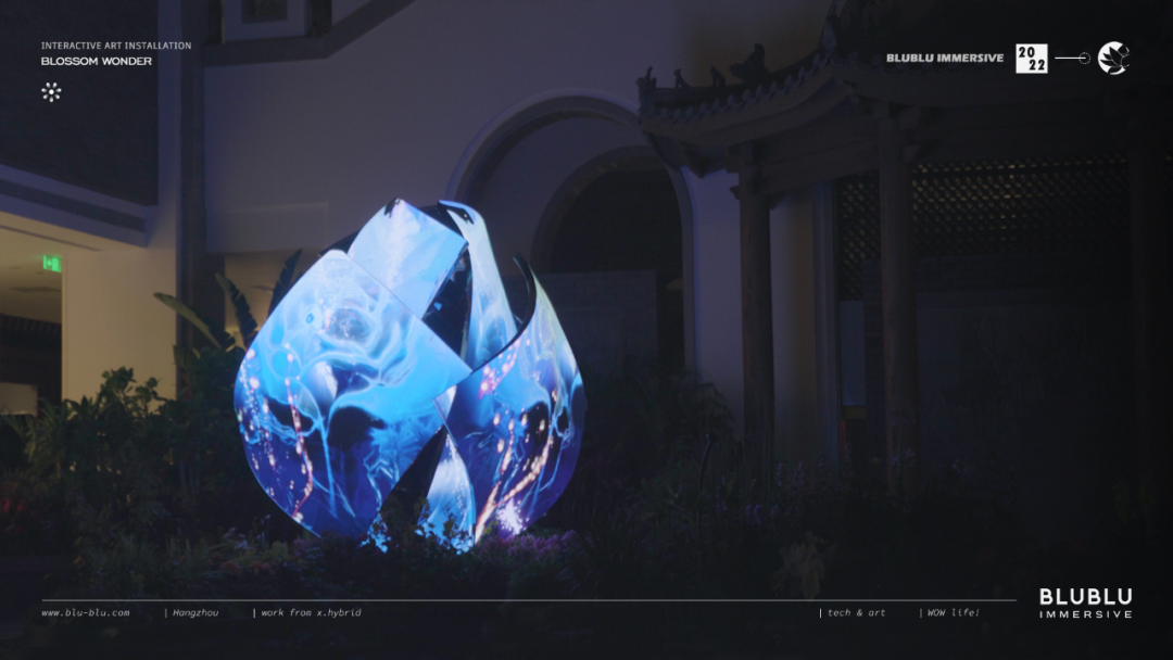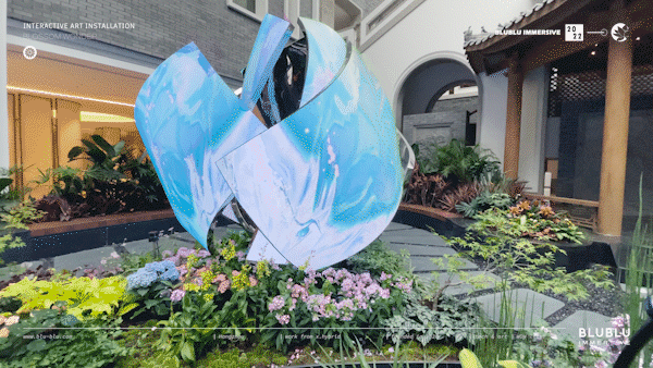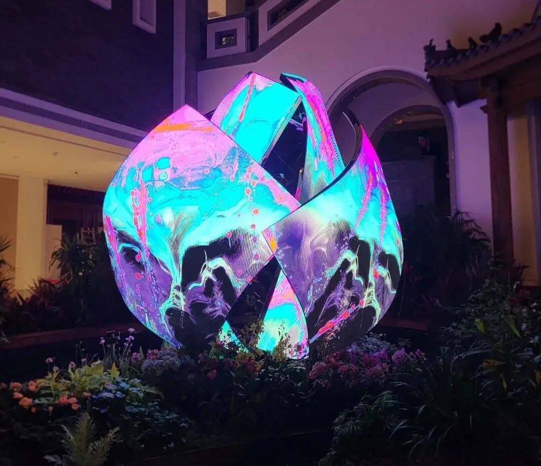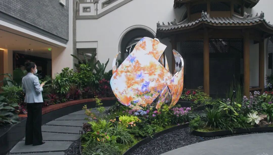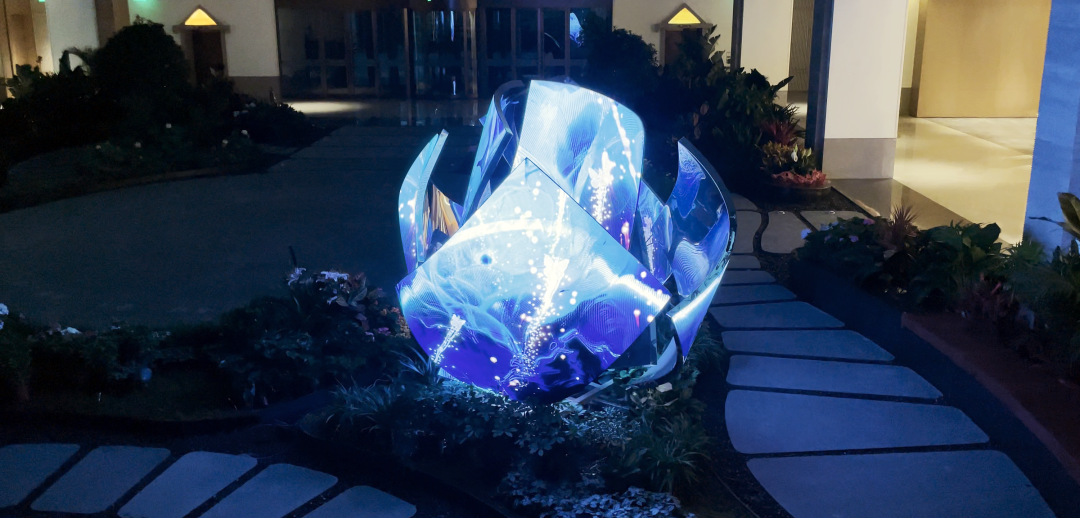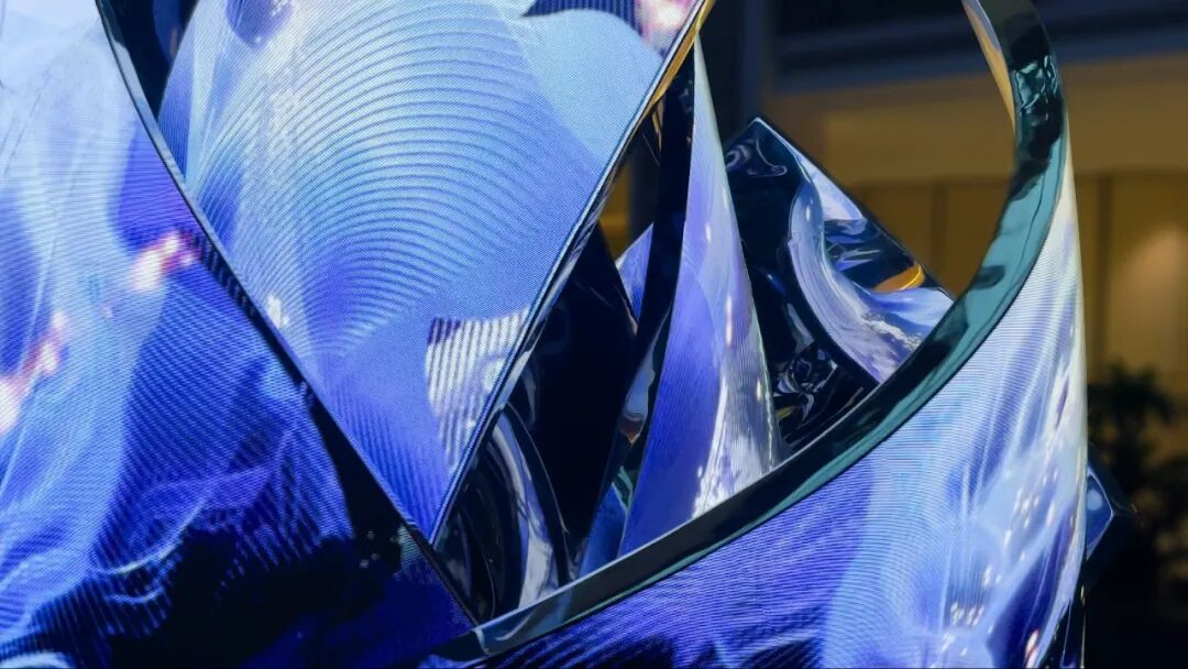 以“花”作为整体造型的灵感,利用超高清LED柔性屏的特性,通过参数化建模,打破了传统显示屏规则形状的限制,创造出动态而富有韵律的曲线弧度,使显示内容更灵活多样。结合全域环绕音场、自然疗愈声效等的应用,为用户呈现了一个多维度、多感官的艺术自然疗愈场域。