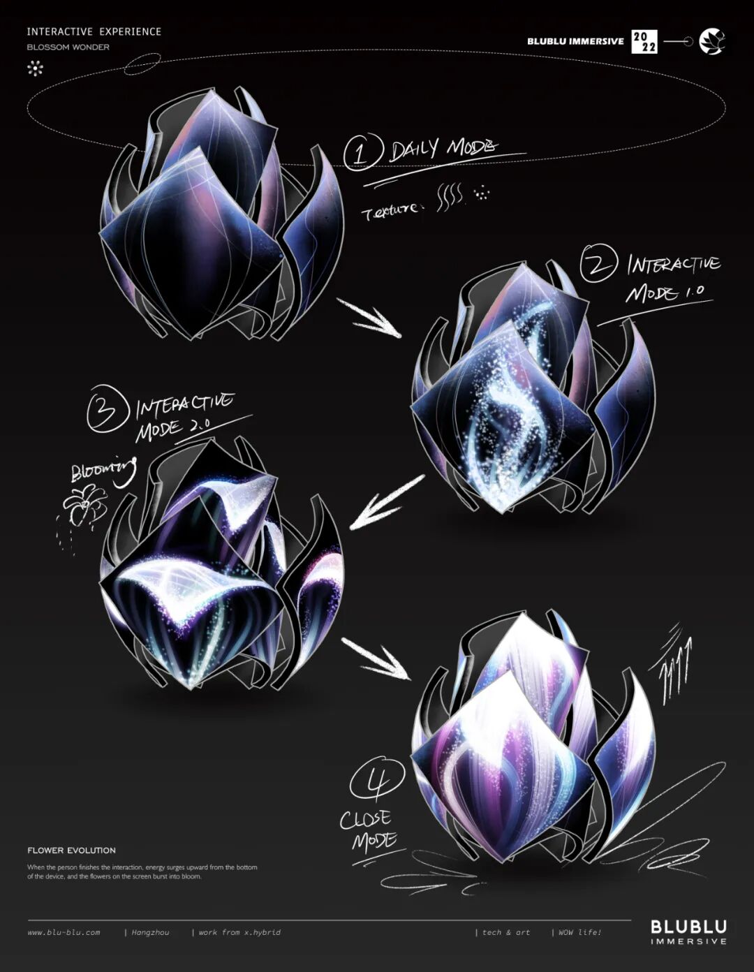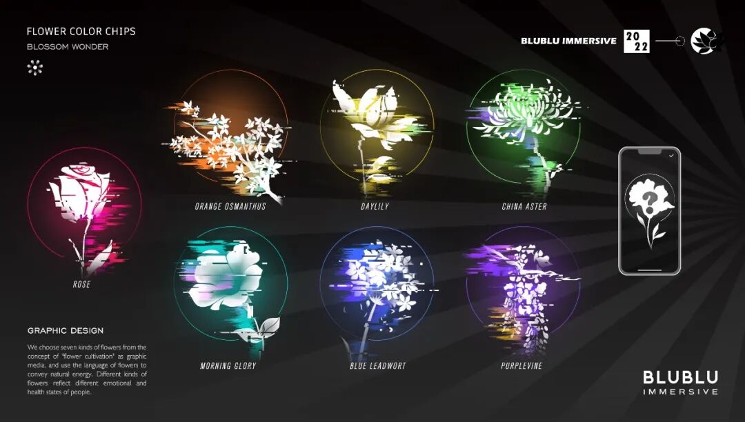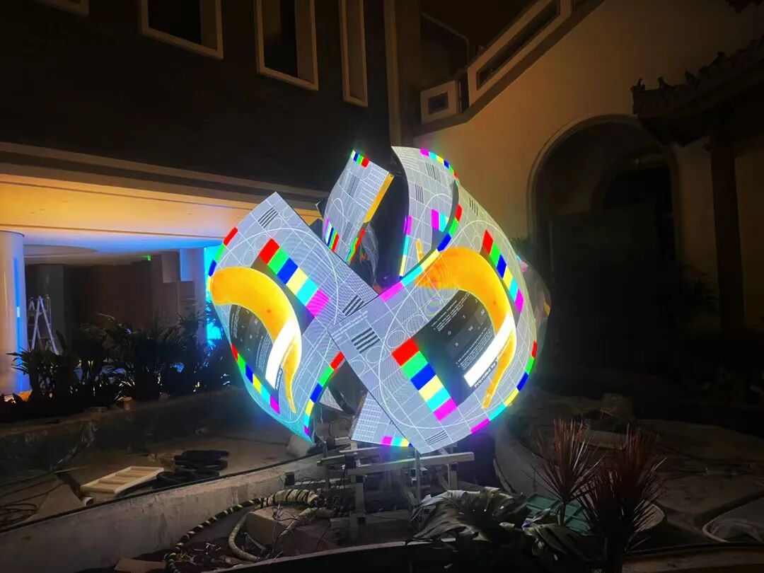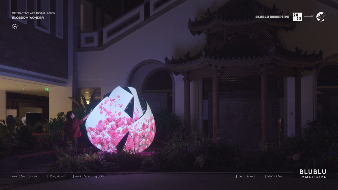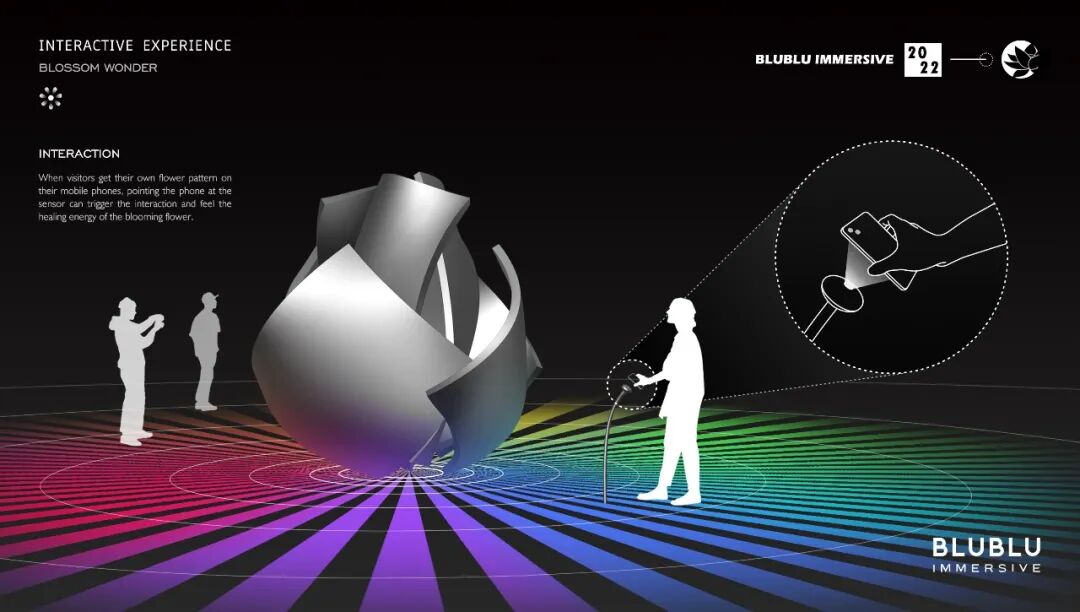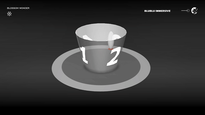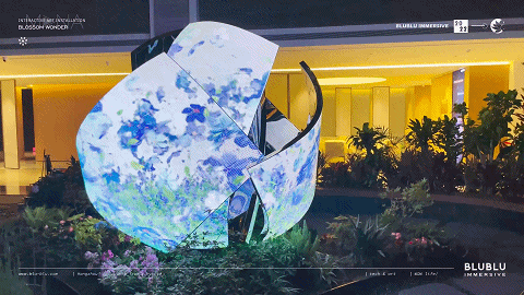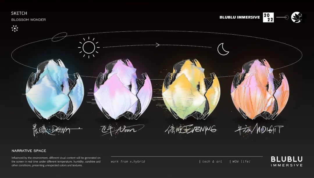 以“花”作为整体造型的灵感,利用超高清LED柔性屏的特性,通过参数化建模,打破了传统显示屏规则形状的限制,创造出动态而富有韵律的曲线弧度,使显示内容更灵活多样。结合全域环绕音场、自然疗愈声效等的应用,为用户呈现了一个多维度、多感官的艺术自然疗愈场域。