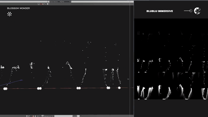 在定位映射系统中,利用雷达检测用户与七色花的距离,以此作为参数控制粒子的释放量,同样地采用OpenCV计算检测区的对象,以装置为中心半径为20m的区域切割并映射到装置的相应位置,最后在检测的位置实时生成旋度噪波粒子。