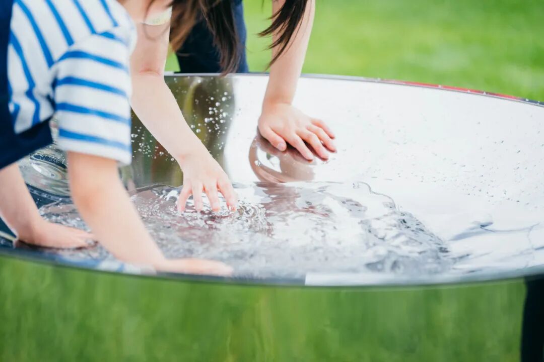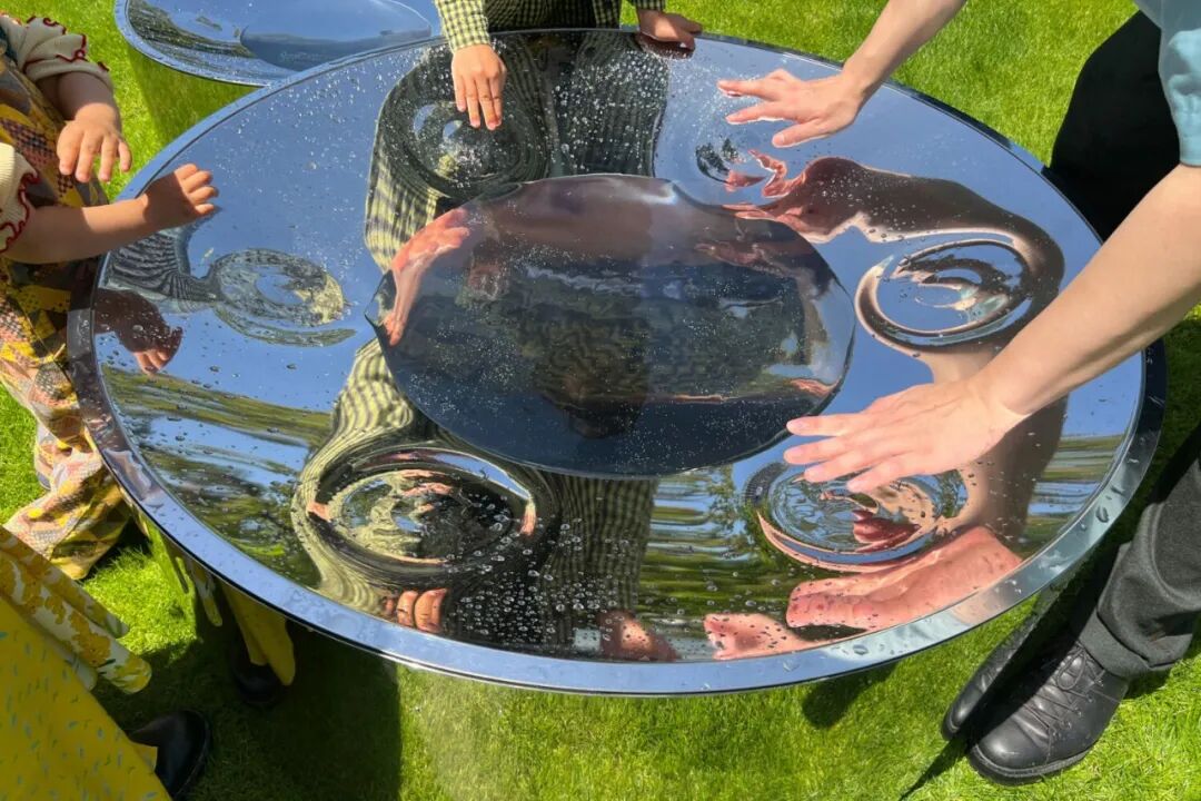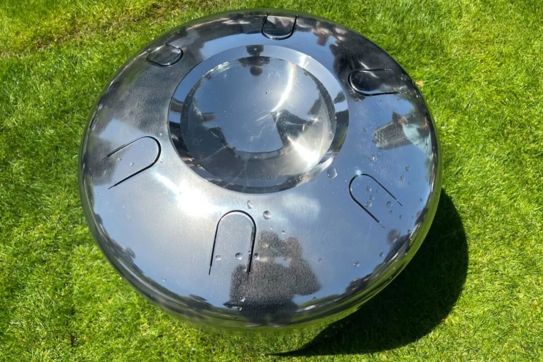 这些像群岛一样星罗棋布的金属装置被称为“狭缝鼓”(hand-pan),是一种打击乐器。 只要敲击装满水的手环,声音的波浪就会变成涟漪并在水中扩散。每个音符分配一到四个音符,并将它们组合成一个音阶。这些音符聚集在一起,击打的声音就会变成音乐,成为另一番风景。
