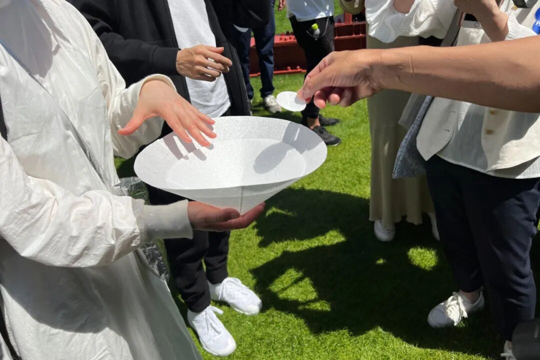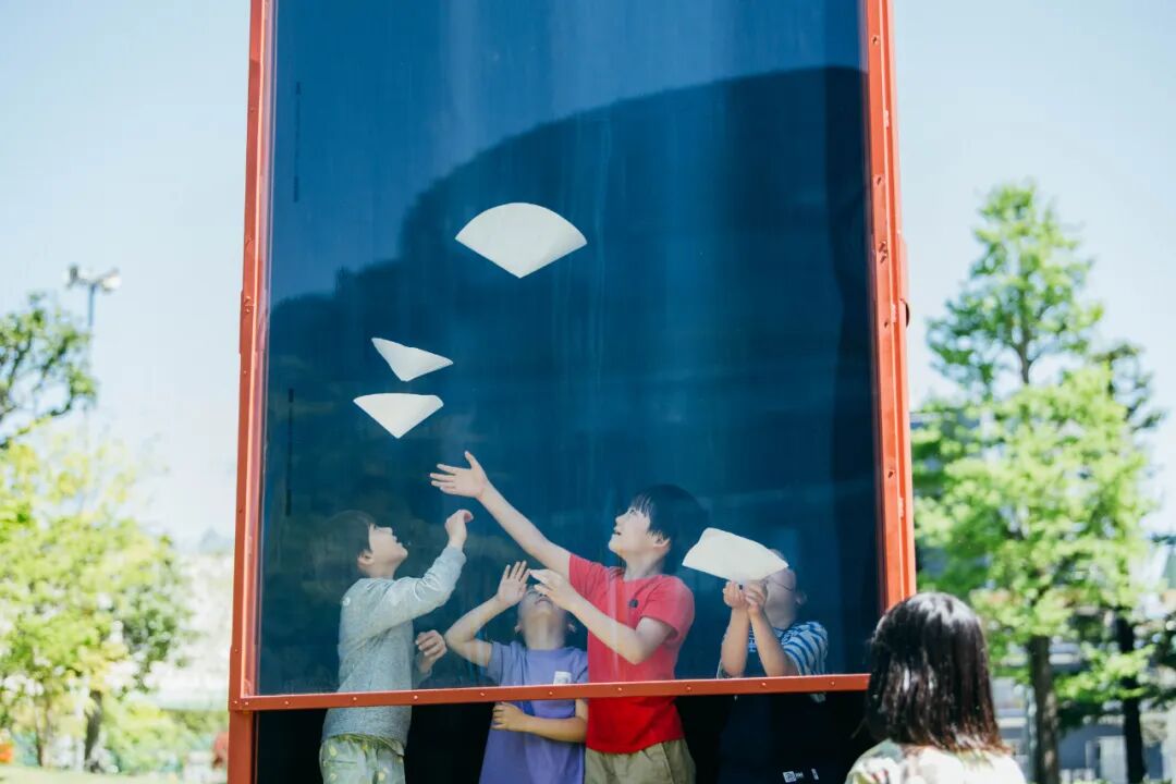 这是一个利用温差和大气压差的简单实验,让孩子们了解风是怎样形成的,以及如何利用风。孩子们将纸片折成圆锥形,在圆柱体内部放飞,与这场“人造风”进行互动。