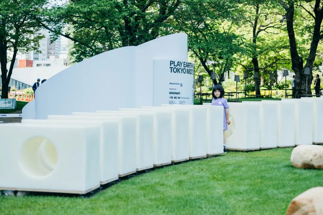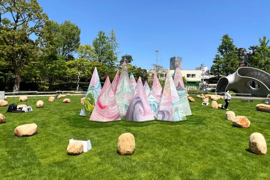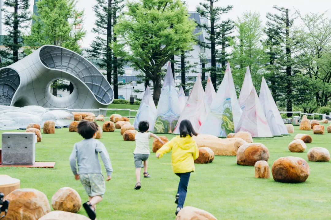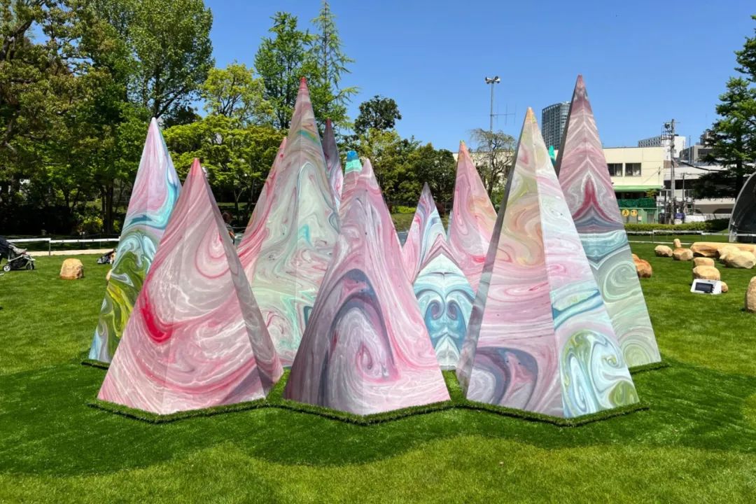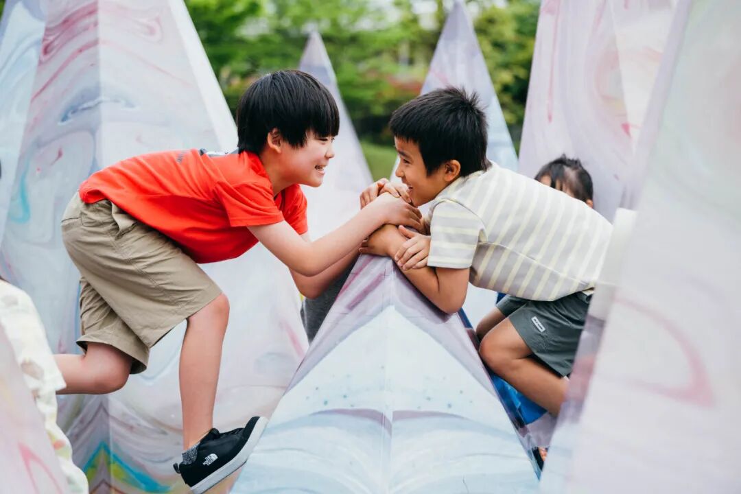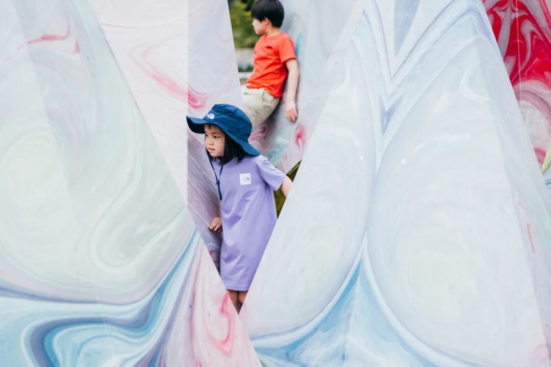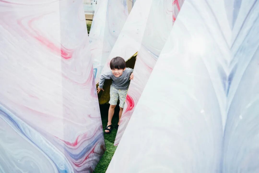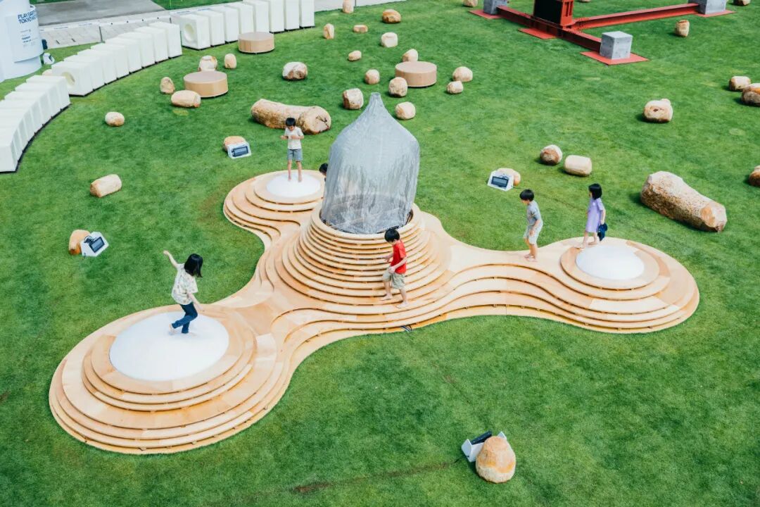 由山田纱子设计的「土地」元素的游乐设施是几座六棱锥组成的装置,它们像大地隆起而形成的岩石和山峦,同时具有大理石的花纹和迷幻的色彩,孩子们在岩壁之间穿行,有时手脚并用爬上顶端,有时则靠在上面。