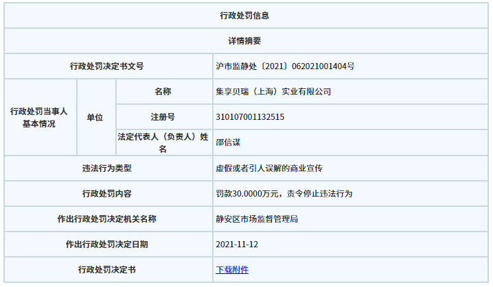 据上海市市场监督管理局网站消息,近日,贝瑞咖啡关联公司集享贝瑞(上海)实业有限公司因存在虚假宣传行为,被上海市静安区市场监督管理局罚款30万元并责令停止违法行为。