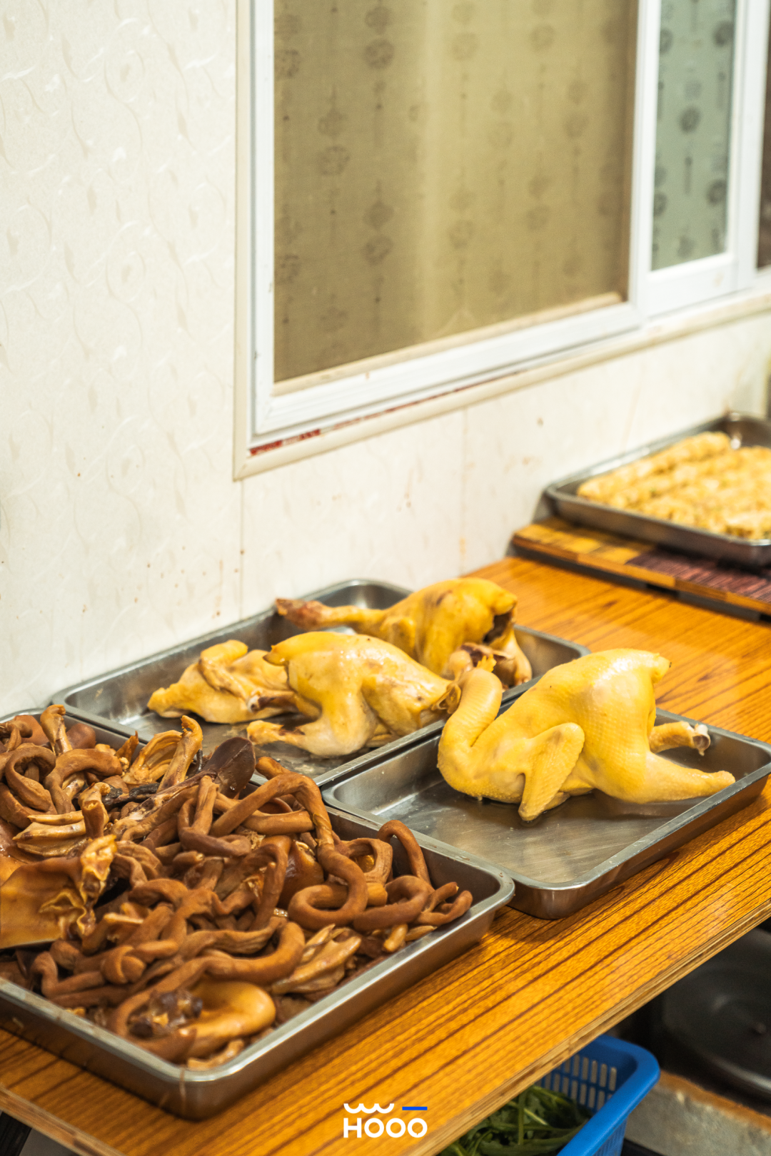 白切鸡肉质极嫩,鸡骨周围的肉略微桃色,骨髓还是带着血的,鸡皮因浸制而变得软糯适口。