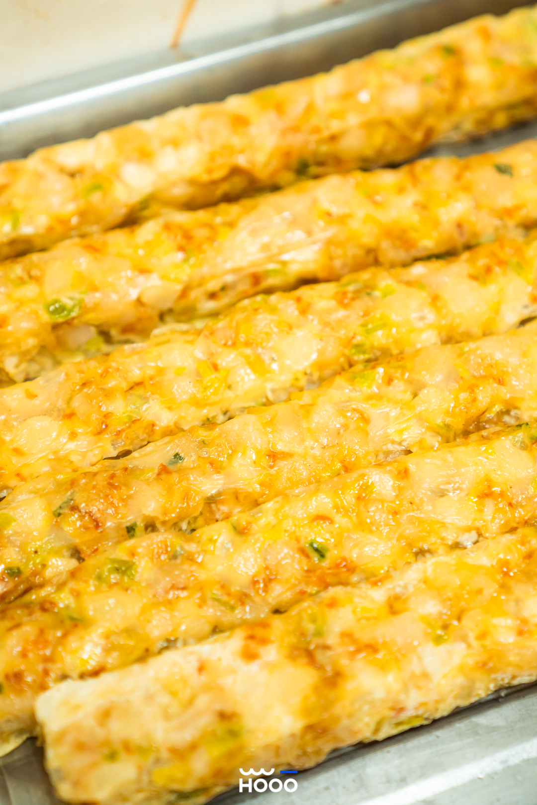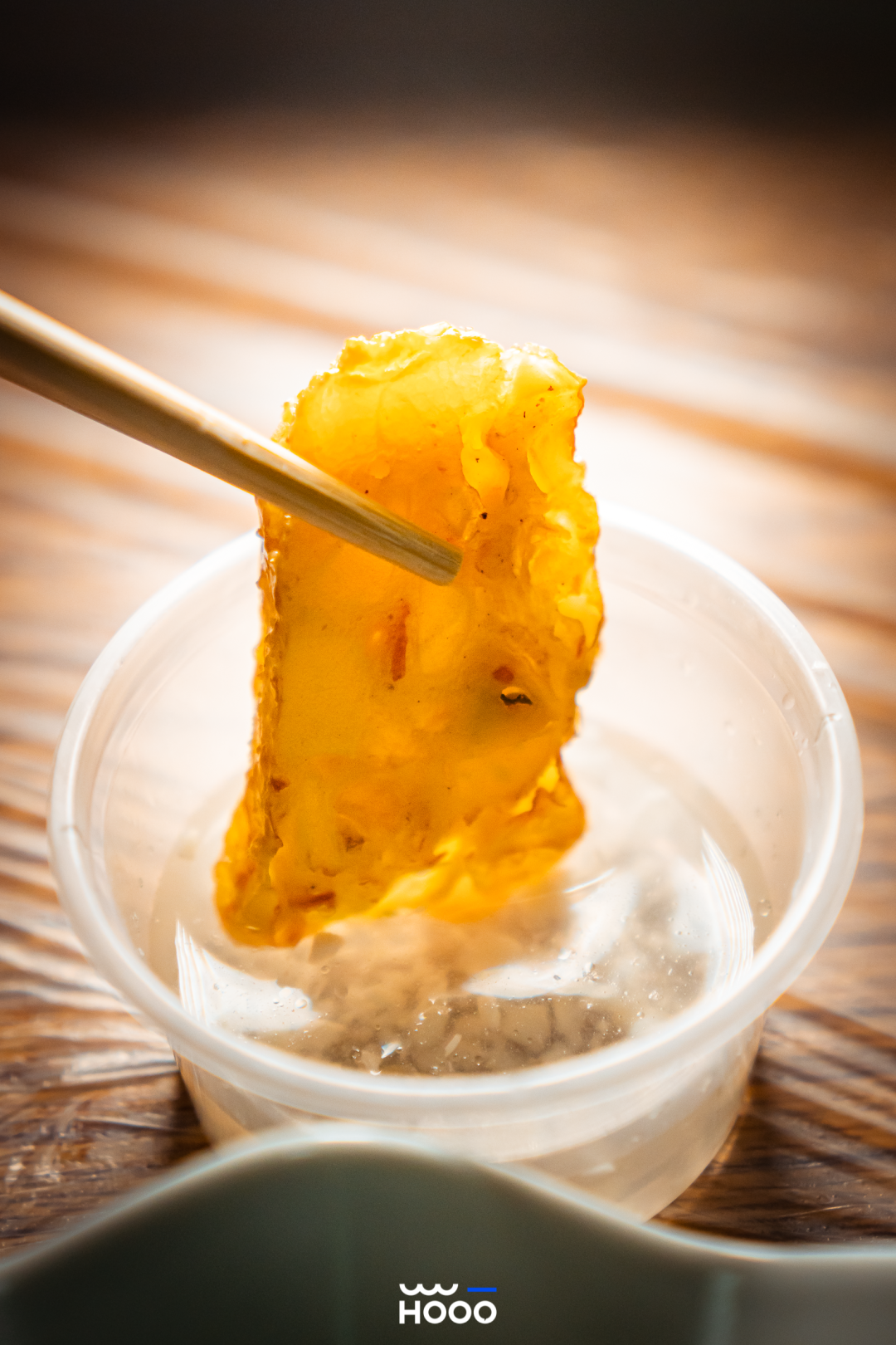 肥肉相间的猪肉与马蹄海虾米一起做成内陷,炸得酥脆的腐竹将其包裹。