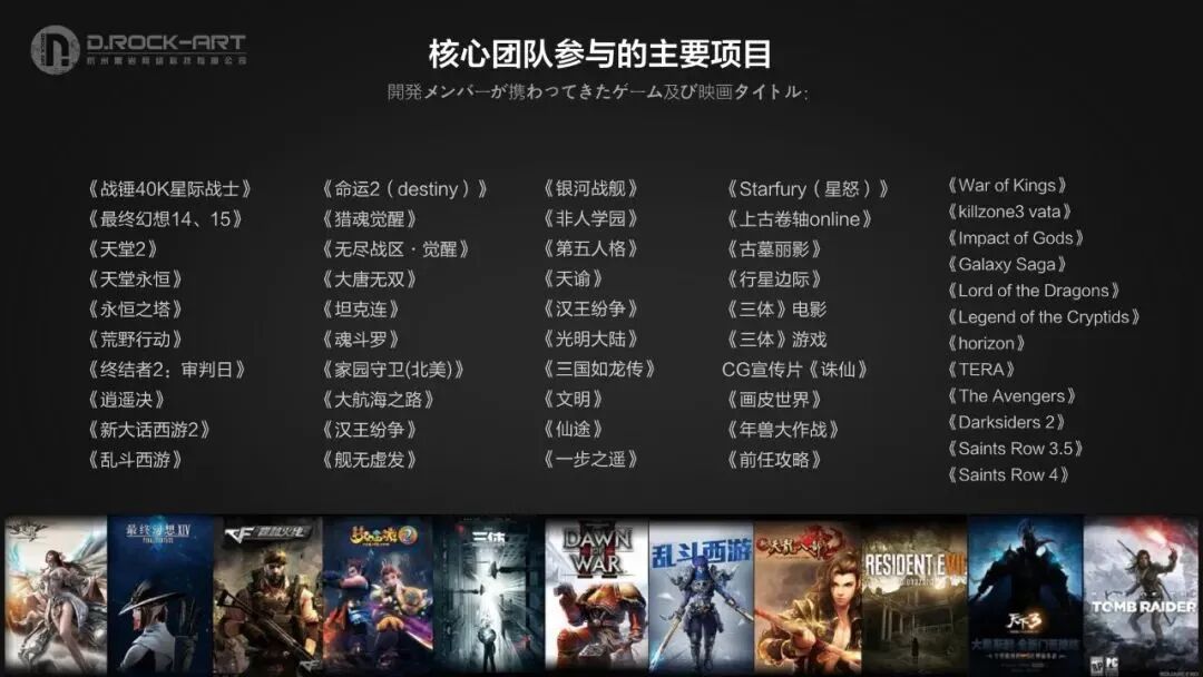 核心团队参与过 《梦幻西游》、《阴阳师》、《第五人格》、《非人学园》、《荒野行动》、《汉王纷争》、《天谕》、《银河战舰》、《舰无虚发》、《漫威:超级战争》、《最终幻想14》、《战锤40K星际战士》等国内外知名影游项目。涵盖移动平台、网络游戏、主机游戏、电视游戏,以及三维动画剧集、CG宣传片、广告片、大电影等多个领域。