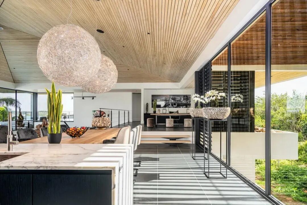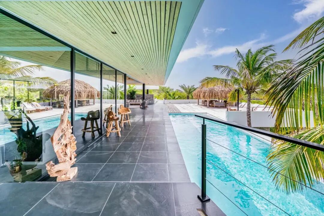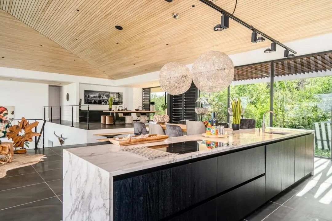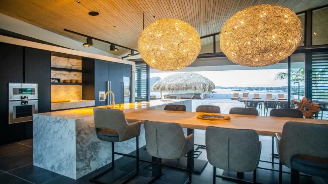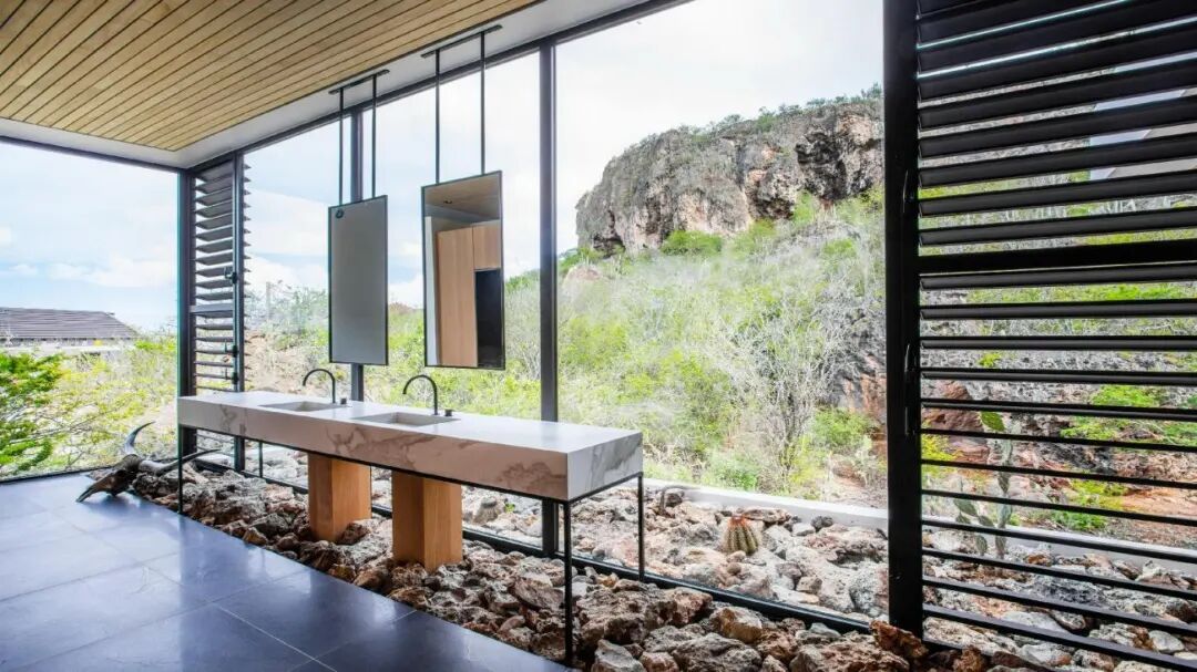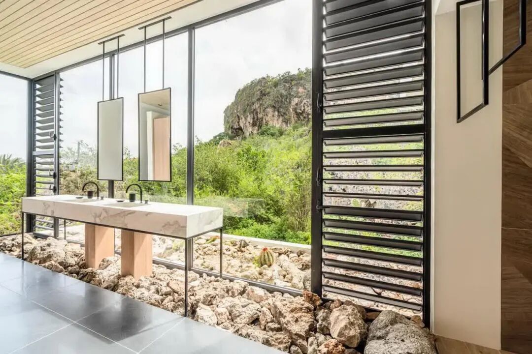 天然岩石遍布建筑的每个角落,甚至在水槽下方也有点缀。盥洗室的镜子从天花板上悬垂下来。如果你想开始新的一天并享受加勒比美食,这栋别墅是一个好去处。