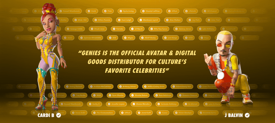 蕾哈娜、贾斯汀比伯、詹尼佛洛佩兹、Offset、Cardi B、J Balvin 等数千名明星都通过和 Genies 的合作进入了虚拟世界,并且 Genies 拥有 99% 的名人化身的市场份额。