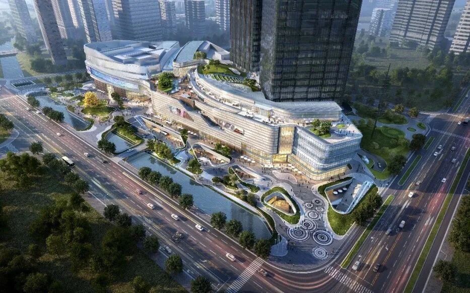 Parkland Tianyue Plaza, located in the core area of Dongguan, including residences, offices and business, is designed by the designers of One Shenzhen Bay together with multiple world-class design teams. CRTKL was responsible for the art center and commercial part of this project. The podiums, which is the primary business area, is a classic commercial complex, with an efficient moving line connecting multiple rich and three-dimensional theme spaces. In the atrium at the entrance, setbacks are designed to extend all the way to the outside; the landscapes are interconnected, creating a relaxing and comfortable environment. The roof gardens of the podium buildings connect 9 separate commercial buildings, forming a lively commercial block. The facades surface is built in the shape of a soaring dragon boat covered with scales. The transparent glass box entrance is very iconic, and shows the wonderful interior space. A sunken plaza is built to connect the underground business and the residential area, and a bridge is built to connect the art center and the centralized business. These features, together with the high-quality business forms, have turned the project a benchmark of wellbeing in Dongguan.