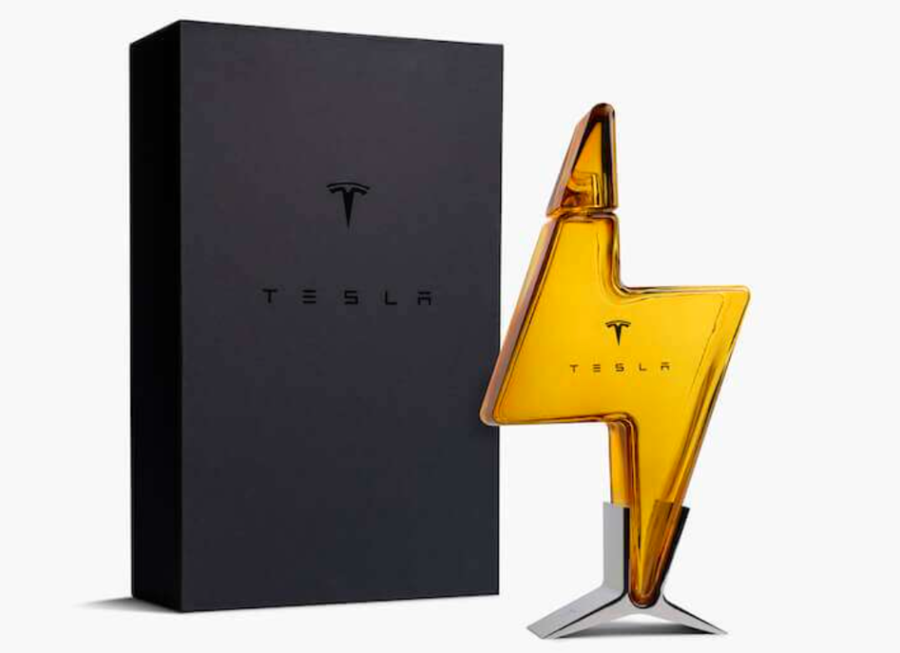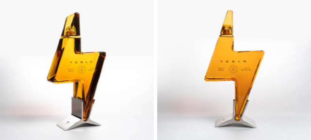 瓶身饰有金色 Tesla 字标和 T 型标志