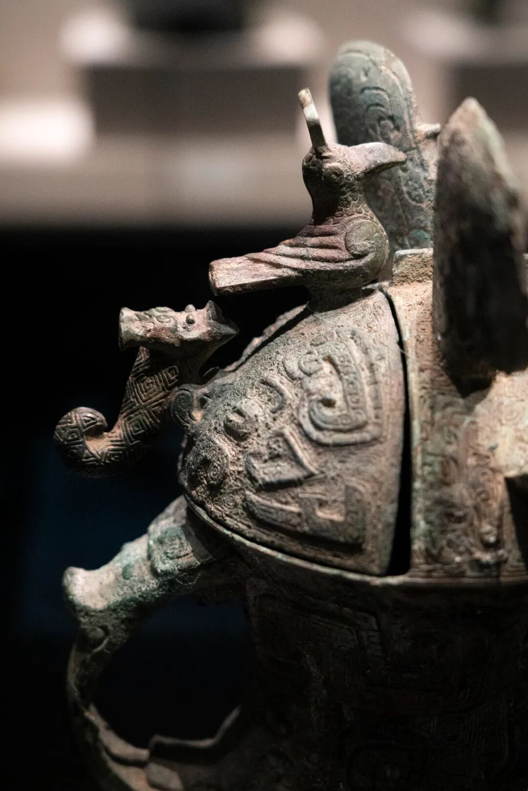 这件鸮尊是中国最早的鸟形铜樽,造型复杂,纹饰生动。