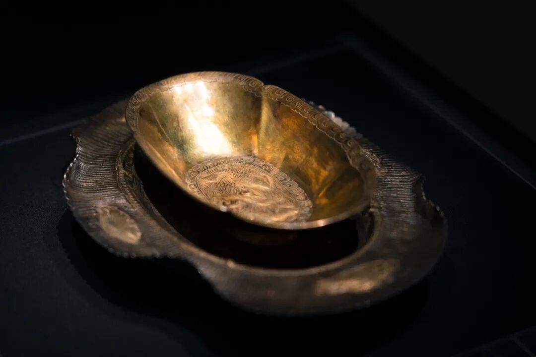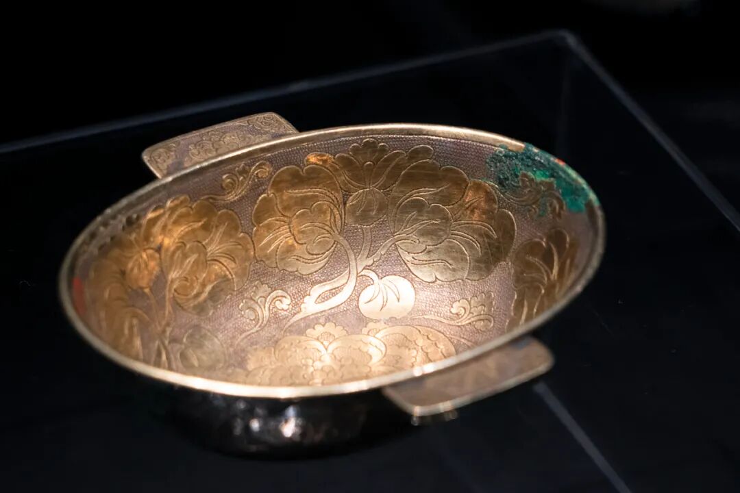 它的身边,还放着一个借展来此的“小金碗”:鎏金蔓草花鸟纹银羽觞。