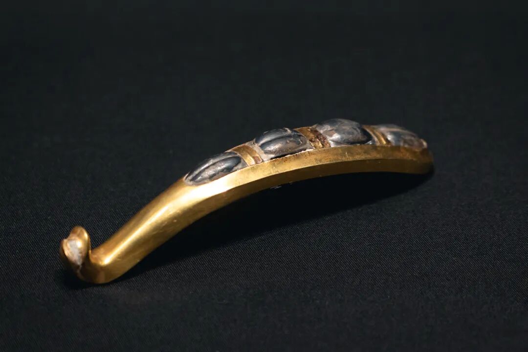 这些带钩,多为通体鎏金,嵌绿松石、琥珀石、玉石等。