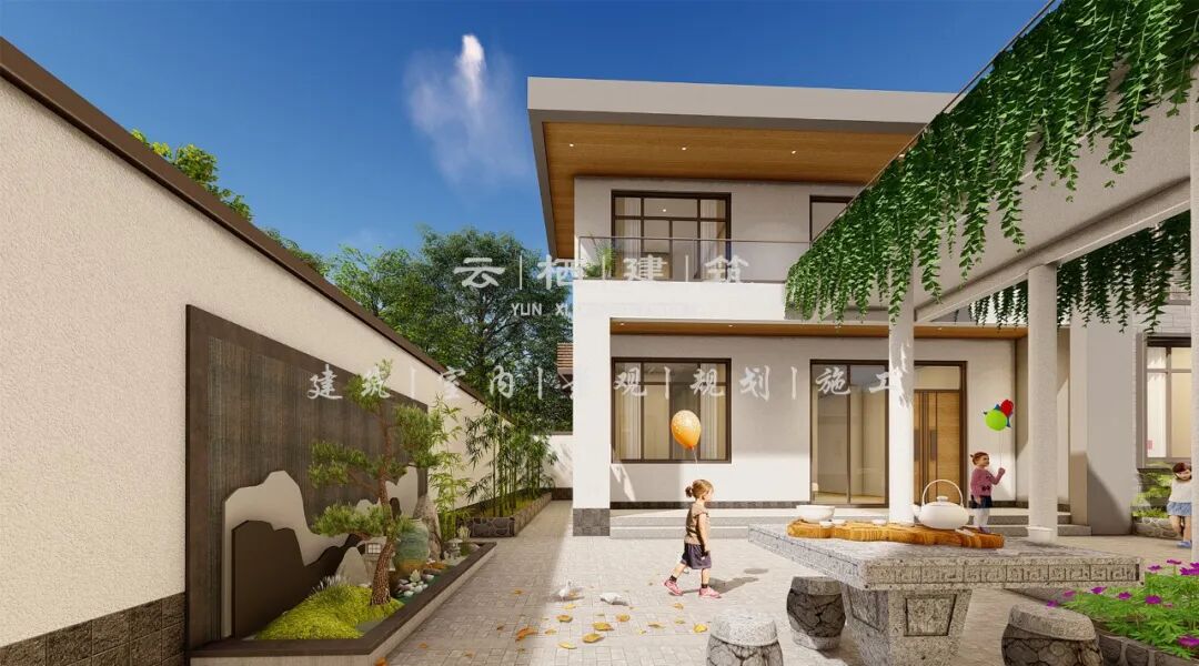 前厅的屋顶用作露台空间,用露天中庭与二层卧室空间进行连接,提高室内的采光和通风,一层门厅处做雨棚设计,形成半室外休闲区,二层则用作阳台,拓展室内活动空间。