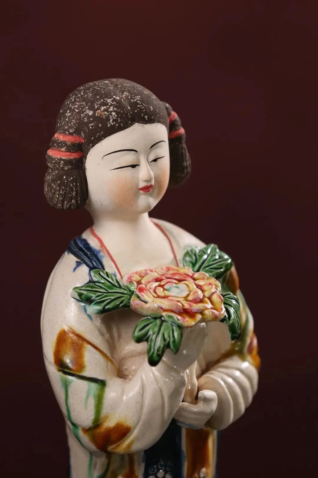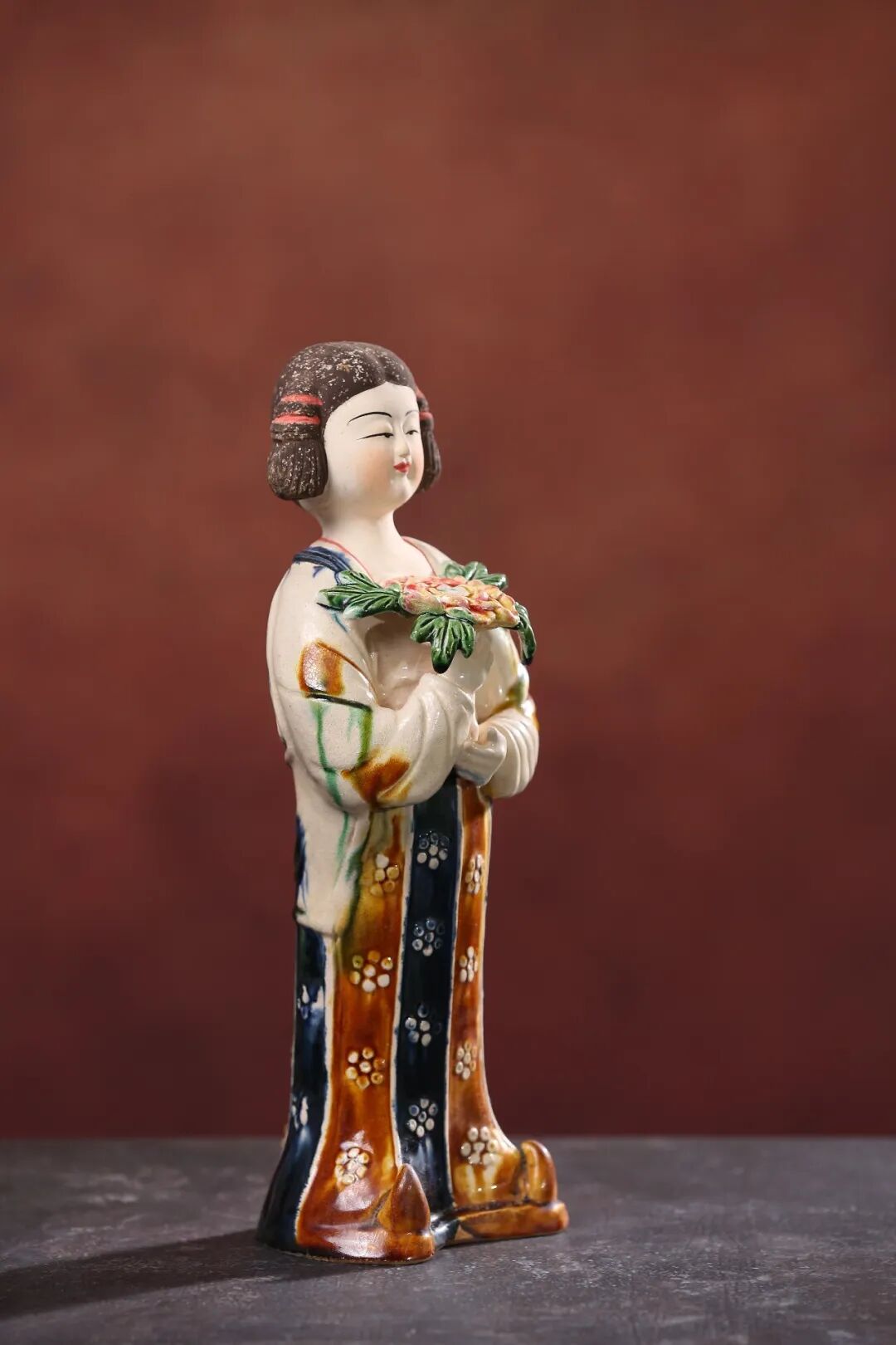 有两个特点和别的陶瓷不一样。第一,唐三彩的釉色最鲜艳,最艳丽。第二,它的品种最多,它什么都能做,不像别的陶瓷只能做器皿,或者是简单的造型。