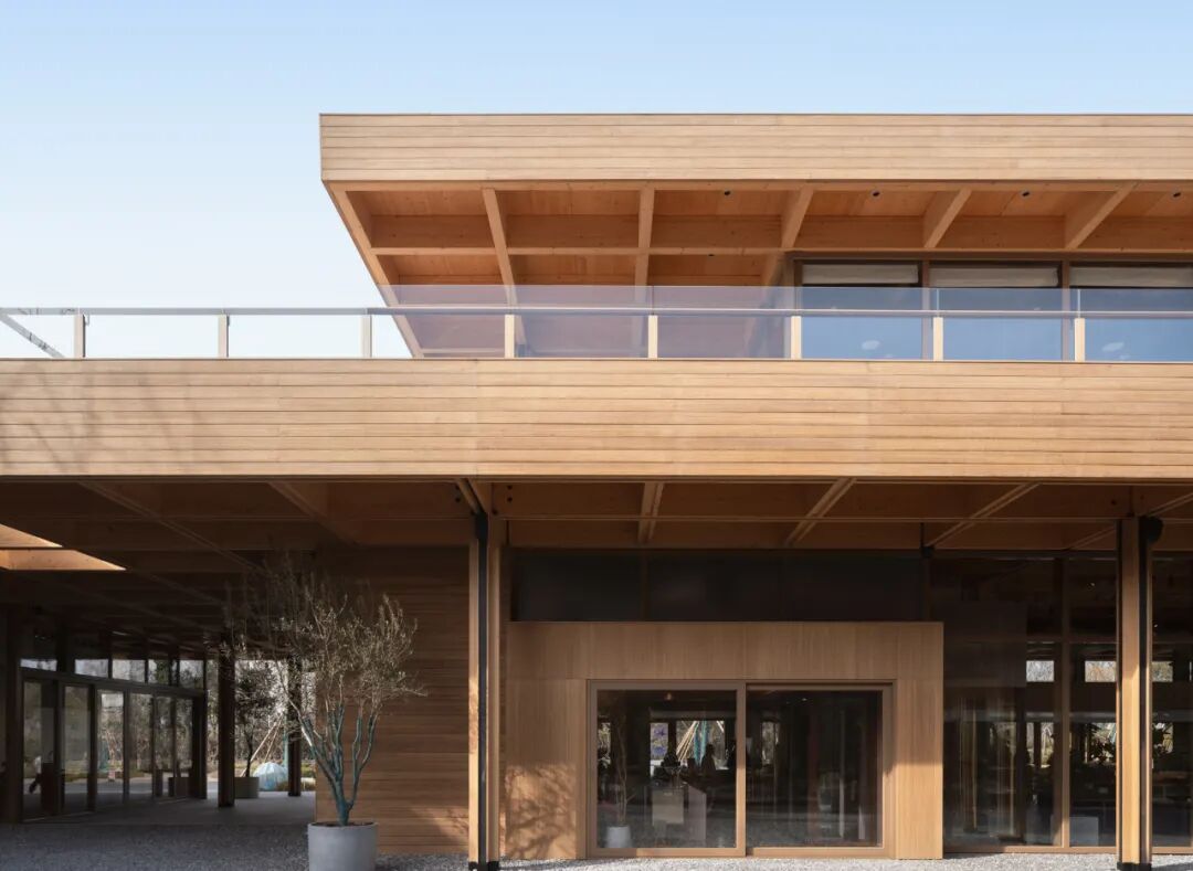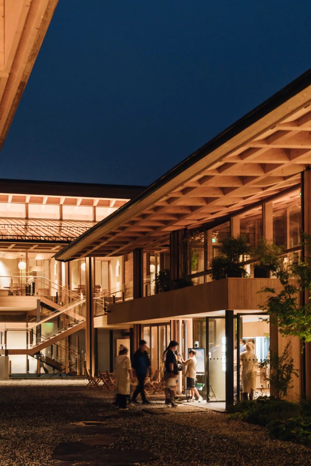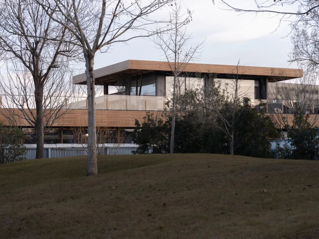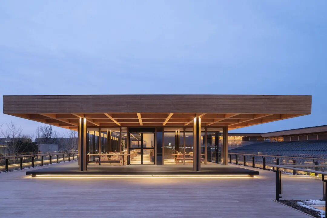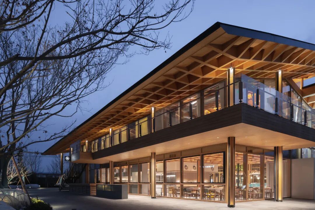 灯光设计接续了退让美学的叙事,弱化景观灯,着重表达自然的阴翳之美。让建筑站上舞台,以原木的金黄映衬天空深蓝的幕布,辅佐少量特定角度的灯光,拉出景观层次,映衬出独特的墨绿质感,在建筑玻璃的透景画面下内外难辨。