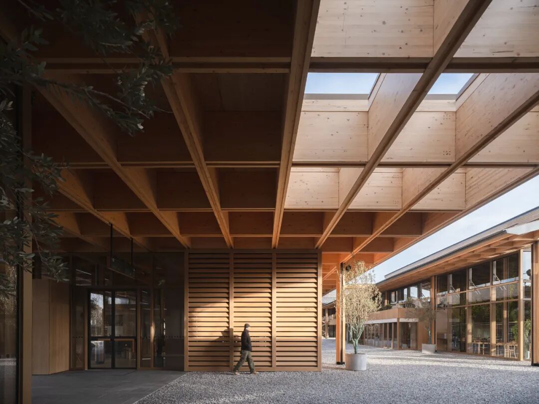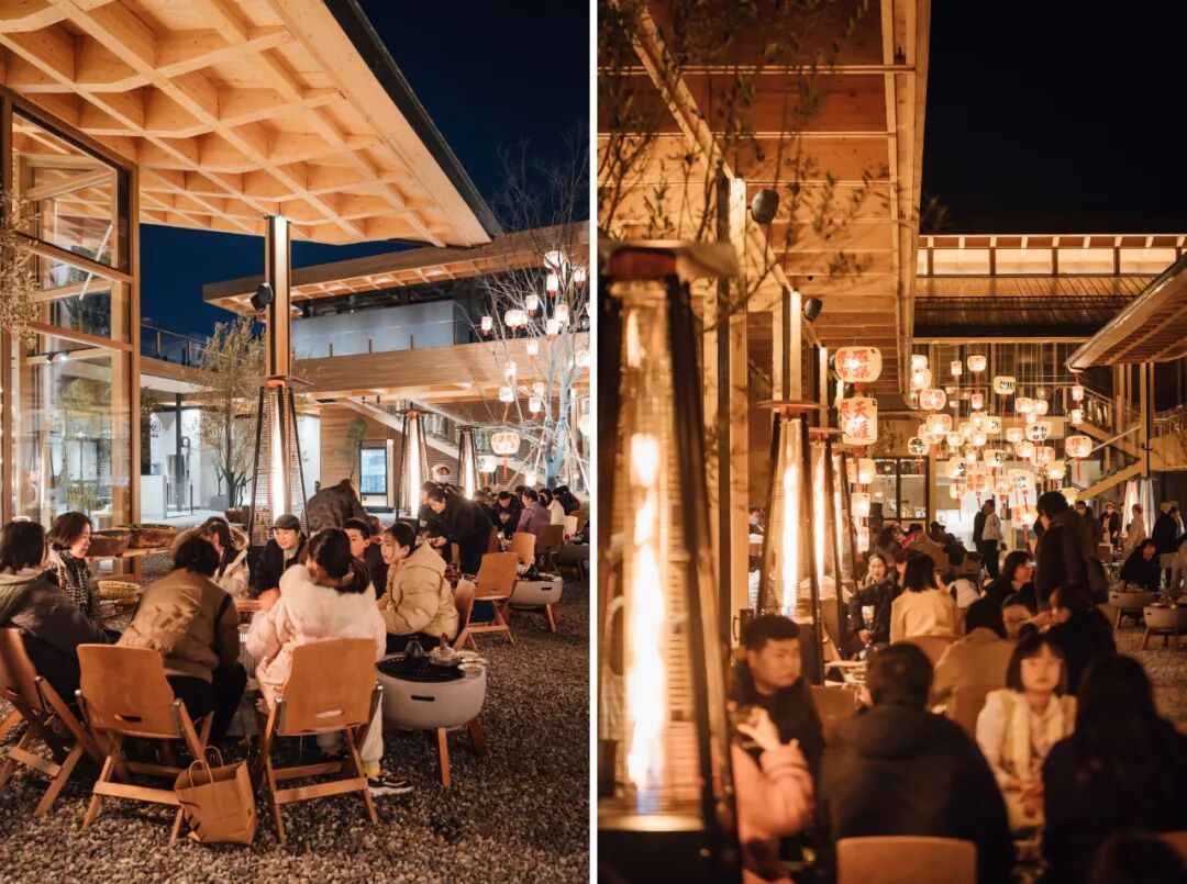 在用地局限、动线交织的基础环境里,绿植难以成林成片,退让与借景成为最重要的设计手法,留出商铺展示画面与舒适活动区域,烘托展现建筑木构之美,在观赏点以花艺手法布置植物,让室内外边界逐步消融。