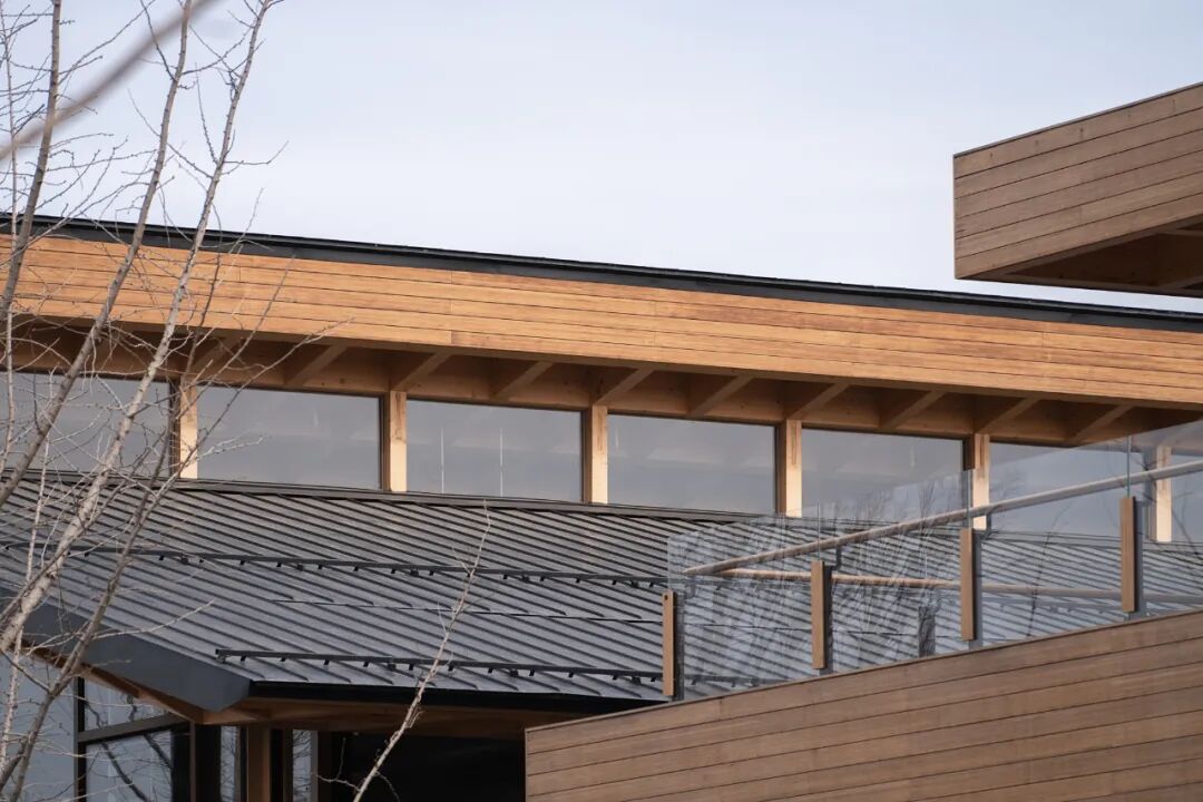 云杉实木与钢结构相接,具有轻便的结构特性,为构建多元的空间提供了无限可能。室内屋面的檩条和椽条位于同一平面内,木质框架结构不做修饰,尽情裸露在外,营造休闲商业气息的同时,秩序分明的搭接将结构美体现得淋漓尽致。