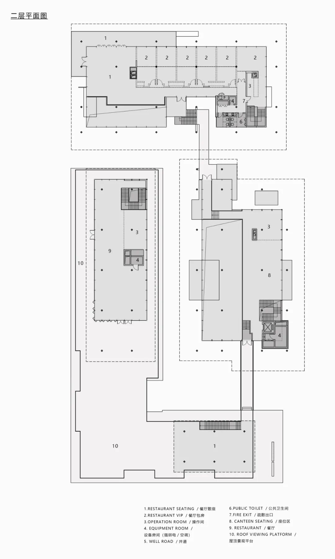 自然元素的屋面可以与公园充分对话,连廊为各栋建筑二层之间的交通提供便捷,加强场地互通的商业氛围,开阔的露台有绝佳视野,让公园的景色尽收眼底,远眺美好生活。
