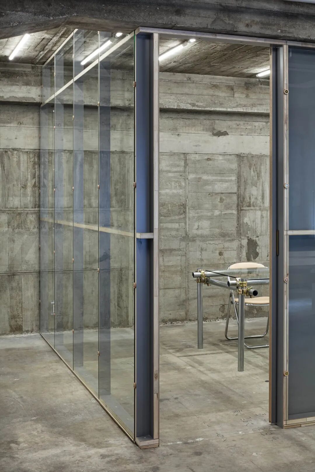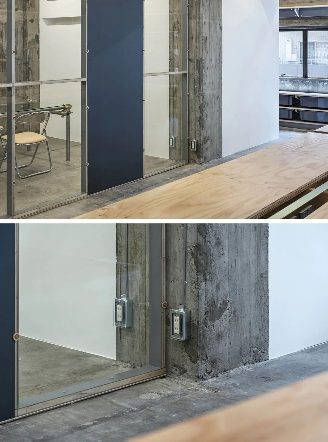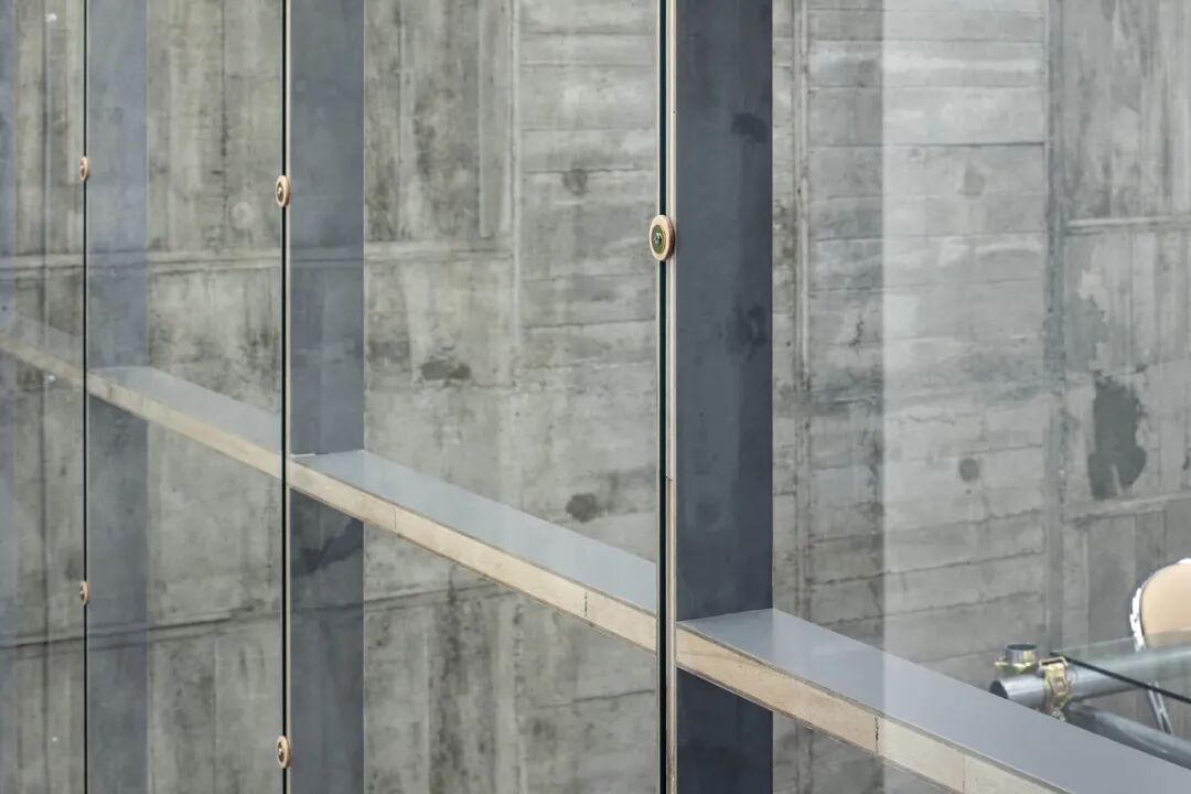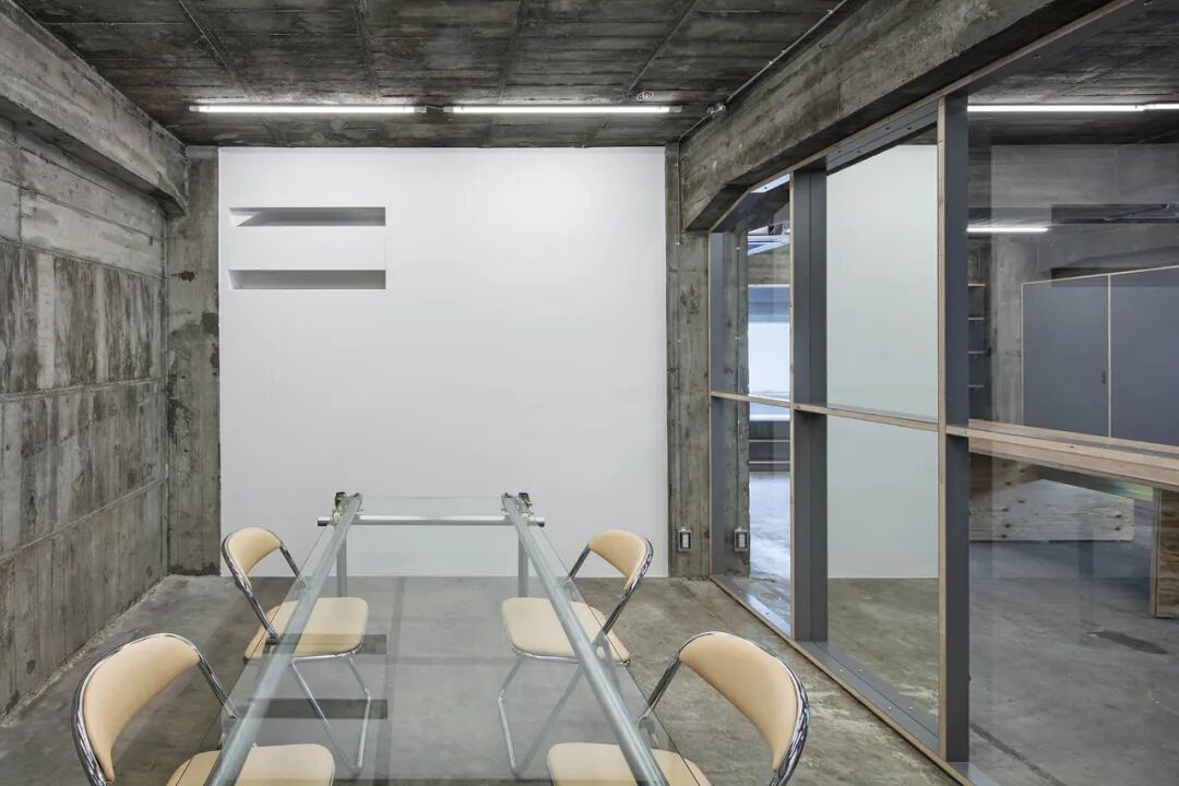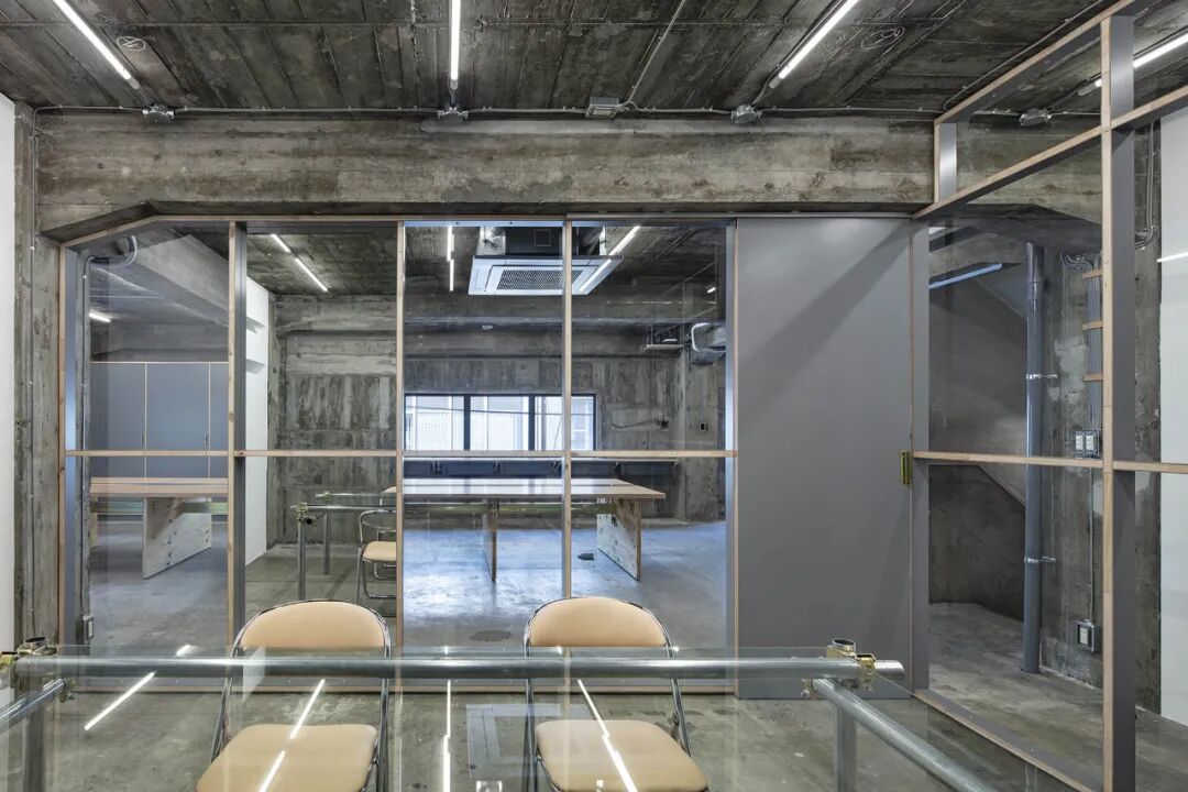 会议室给人的印象是办公室的中心空间,一张玻璃桌突出了脚手架用钢管制成的腿,桌子的细木工细节现在基本上变成了建筑细节,工业前景被Hender Scheme 的真皮软垫椅。分隔办公室和会议室的玻璃隔板之一是一面镜子,从办公室可以看到的垂直灰色表面是那面镜子的背面,作为一种相当不寻常的表面处理加倍。镜子和玻璃,厚度相同,直接用螺丝固定,用皮革做垫圈。完全暴露在其路线中的电线和导管被小心地布置在混凝土墙上,并使用毛边皮革固定到位。