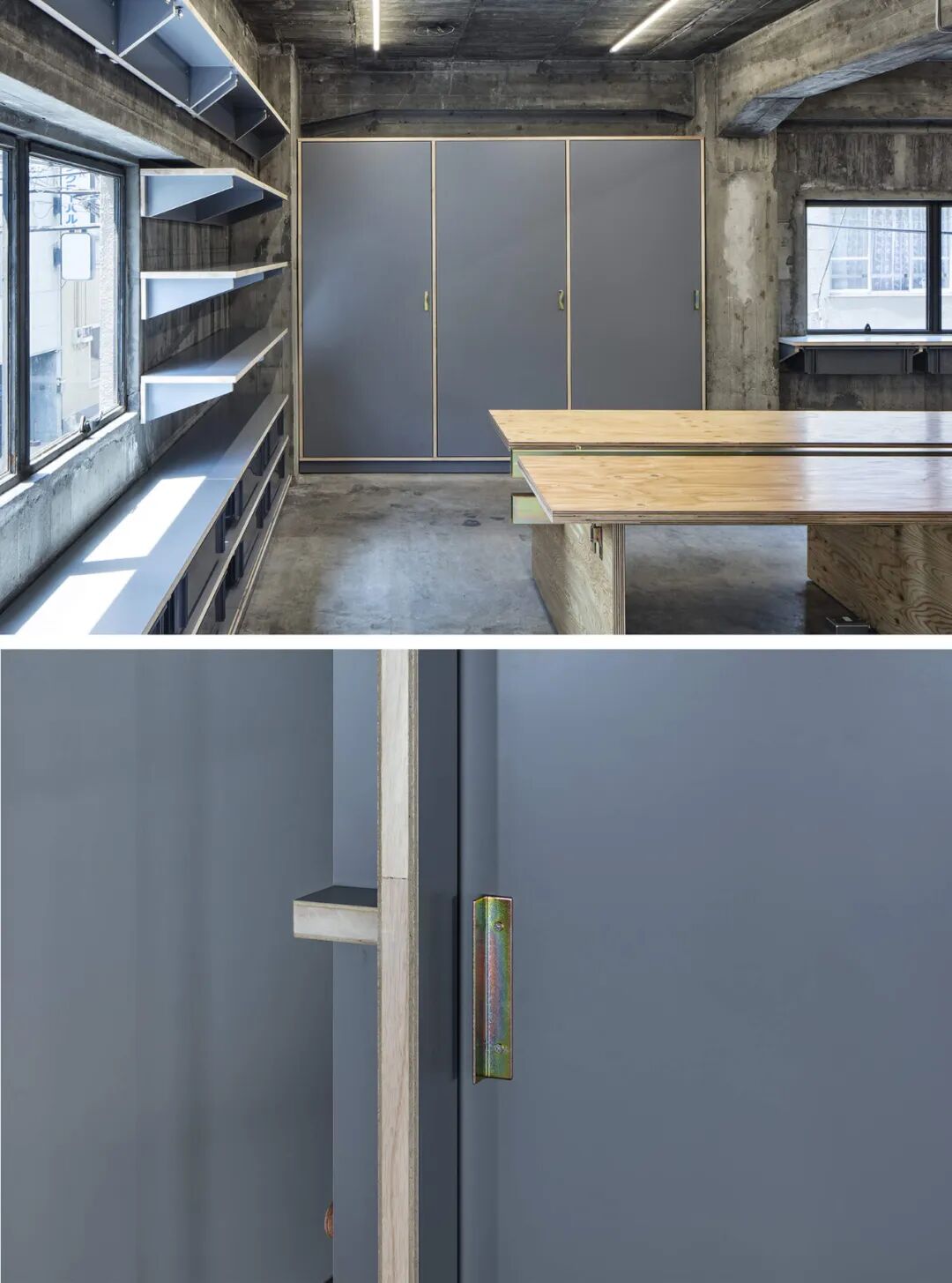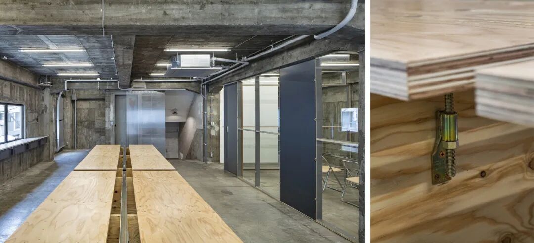 另一件赋予空间独特结构工业外观的决定性家具是位于中心的大型会议桌,由长度超过 3m 的大型结构胶合板组成。在这里,细木工细节也被转化为建筑细节,使用五金件来固定木屋的传统施工方法。由于结构胶合板的尺寸固定,书桌被设计成700mm的深度,中间的一个缝隙提供了电源布线的空间,由毛边钢方管支撑并作为纵梁,还为电源插座提供空间。