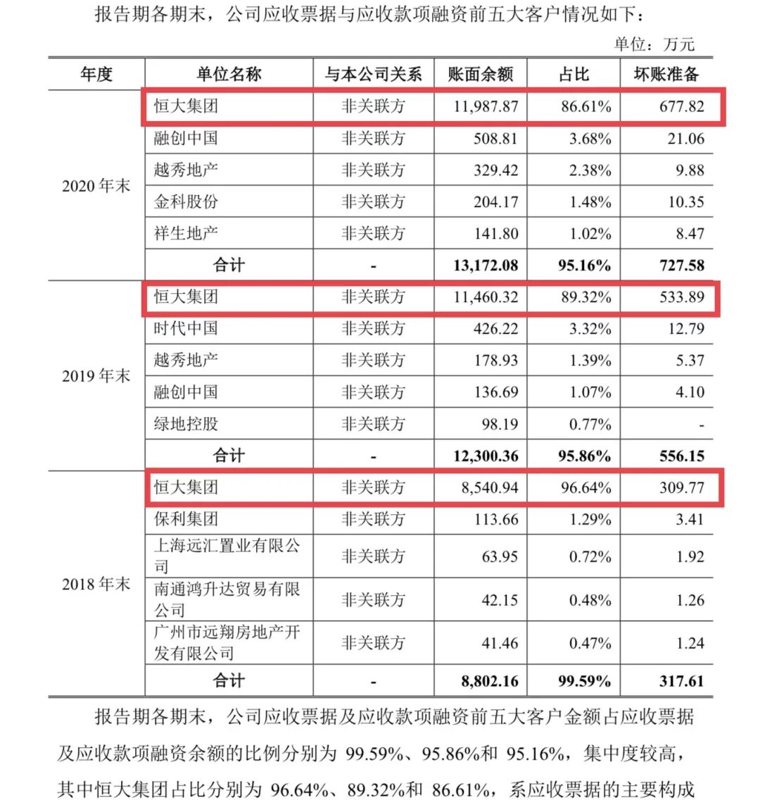 Z Media了解到,一直以来,恒大都是幕墙门窗龙头企业嘉寓股份的最大客户。年报显示,从2017年到2019年,嘉寓股份来自恒大的销售额分别为8.55亿元、17.8亿元、11.87亿元,最高时占当年销售总额的比例达到41.86%。