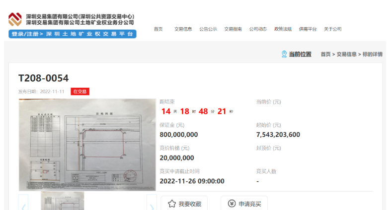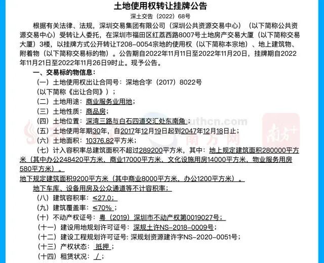 最新文章2024-02-28 恒大转让深圳超总地块总部大楼!起始价约74.5亿 眼看他起高楼,眼看他宴宾客,眼看他楼塌了。 转自|不画图的建筑师 作者|不画图的建筑师 编辑|金鱼婆婆想退休 “双十一”这天,恒大决定卖掉位于深圳南山区的“深圳湾超级总部基地”地块。 11月11日,深圳公共资源交易中心上线了一则新的土地转让信息,受转让人委托以挂牌方式公开转让位于南山深湾片区的T208-0054宗地使用权、地上建筑物、附着物,该地块为商业服务业用地,转让起始价约为75.4亿元,竞买保证金约为8亿元。 该宗地占地面积约为1万平方米,计容建面约为29万平方米。恒大在2017年12月拿下该块地,当初是以底价55.52亿元成交,原本计划建成恒大超级总部,并于2024年竣工。 目前因资金问题处于停工状态。地块将于2022年11月26日9时进行转让。 还有更多消息:海南澄迈土地出让新要求:竞买人要完成恒大项目“保交楼”任务! 01 深圳超级总部地块详情 T208-0054宗地位于深湾三路与白石四道交汇处东南角,土地用途为商业服务业用地,土地性质是商品房,土地使用年期30年,自2017年12月19日起到2047年12月18日止,土地面积为10376.82平方米。 计入容积率总建筑面积不超过289200平方米,其中:地上规定建筑面积280000平方米(其中办公248420平方米,商业17000平方米,文化设施用房14000平方米,物业服务用房580平方米)。 地下规定建筑面积9200平方米(其中商业8000平方米,办公1200平方米),地下车库、设备用房及公众通道等不计容积率。 建筑容积率≤27.0;建筑覆盖率≤70%。 瑕疵及其他注意事项: 1、本宗地建设项目自2021年9月开始停工,项目基坑桩基础已完成,土石方大面已开挖至基底标高(-42.40米),基底承台和坑中坑尚未完成,宗地按现状转让。 2、本宗地建设项目因长期停工、主体施工总承包单位尚未定标,后续基础底板相关工作无法正常启动。同时因资金问题,土石方单位和基坑支护单位现已停工。项目可能存在包括但不限于基坑变形、渗漏裂隙及积水、钢筋等材料锈蚀、影响片区地下道路建设、临时用地收地、安全隐患等一系列问题风险,相关问题风险由竞得人自行评估并承担。 3、本宗地建设项目已办理完成部分报批报建手续,包括限高审查、消防设计审查、环评批复等,尚未取得消防审查意见书等。竞得人竞得后需自行重新办理/变更相应报批报建手续,相关风险事项由竞得人自行评估并承担。 4、本宗地建设项目存在逾期竣工风险,存在被无偿收回土地使用权及地上建筑物、附着物的风险,相关风险事项由竞得人自行评估并承担。 5、本宗地存在被认定为闲置土地的风险,如宗地被认定为闲置土地,按国家和深圳市关于闲置土地相关规定处理,相关风险事项由竞得人自行评估并承担。 6、本宗地建设项目存在包括但不限于临时用地使用期已满、逾期使用欠费、拖欠工程款,合同相对方索赔、维权等问题,存在的经济与法律风险由竞得人自行评估。 7、转让人已与南山区人民政府签订《T208-0054地块产业监管协议》,由南山区人民政府对本宗地项下的总投资额、产值规模、地方财力贡献等事项进行监管,并约定土地使用权人就监管事项应满足的标准和条件。该协议须由竞得人承接,若后续竞得人根据实际情况需调整本宗地的相关产业监管要求及实际监管的,由竞得人自行评估风险并与政府相关部门协商。 8、根据土地出让合同约定,本宗地项目建成后存在部分物业须在约定期限内自持的要求,竞得人须承接相关要求。挂牌成交后,竞得人因实际需要对项目的销售限制条件进行调整的,应按程序报市政府批准。经市政府批准同意的,竞得人应按规定补交地价。 恒大中心高393.9米,共75层,办公、商业、展览等功能多元垂直复合。建筑在多个层面设置有人行口,地下三层车库接驳城市地下车行环道。项目基坑深度为42.35米,为国内房建项目最深基坑,离地铁隧道近,入岩深度大且岩石强度高。 塔楼核心筒偏北布置,在南侧营造出滨海的开敞办公空间。设计融入“天圆地方”意象,底部方正,顶部圆润,形体收进,拔地而起,象征恒大人扎根深圳、开拓进取、再攀高峰。同时,此形体设计也有效降低了风荷载的影响。项目推进过程中,在全球定制了数十种深浅不同的金色玻璃幕墙样板进行选择,以确保达成与深圳湾天际线的最佳适配效果。 02 五年前55.5亿拿地 打造恒大深圳湾超总 查看此前的资料显示,T208-0054宗地于2017年12月19日 由恒大集团有限公司以出让起始价人民币555200万元竞得,原本要打造恒大总部。当年深圳湾超级总部基地出让了两宗商服用地,其中: · 万科以底价31.37亿元拿下T208-0053宗地,楼面价1.88万/平; · 恒大以底价55.52亿元拿下T208-0054宗地,楼面价1.92万/平; 公告显示,两宗地块均位于南山深圳湾超总基地,且土地使用年期均为30年。其中被万科拿下的T208-0053宗地为“商业服务业+道路用地”,土地面积约19228平方米,建筑面积16.7万平;被恒大拿下的T208-0054宗地为“商业服务业用地”,土地面积约10378平方米,建筑面积28.92万平。 其中,恒大拿下的T208-0054宗地项目建成后:86760平方米(总建筑面积的30%)的办公面积部分可按规定销售;物业用房全体业主共有;其余部分自规划验收之日起15年内不得转让,其中文化设施用房届满后限整体转让。 深圳湾超级总部的定位是“世界500强企业总部基地,未来将成为全球高端产业集