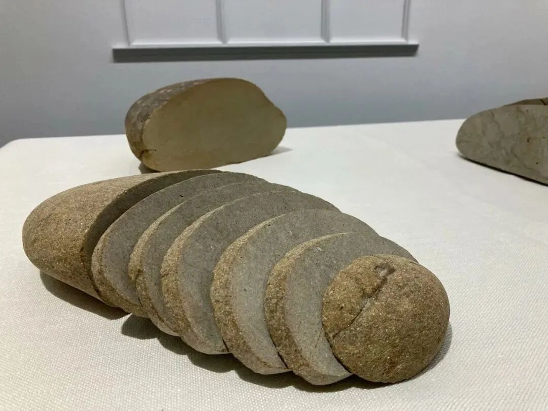 来自乌克兰的艺术家詹娜·卡德罗娃(Zhanna Kadyrova)在 3 月从基辅撤离到乌克兰西部的山村中,开始收集河里的石头制作成石头“面包”,这组艺术品名为《Palianytsia》,在乌克兰语中指“一块圆面包”。塑造食物表达了詹娜·卡德罗娃对日常与和平的渴望,战争爆发时,她觉得艺术像梦一样脆弱,而现在她相信艺术能让人们听到她的心声。