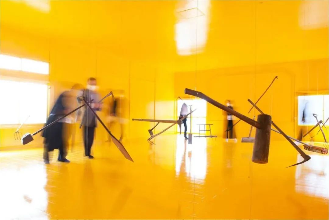 上田市民会馆2楼艺术家川口达夫涂成了黄色的空间,农夫们曾经使用过的、沉睡在谷仓里的各种农具,如犁、锄头、镰刀等,悬吊在这个黄色空间中,而且这些农具似乎都挂在了人们可以照原样使用的姿势。仿佛它们在一个神秘的、静止的时间里积蓄力量?