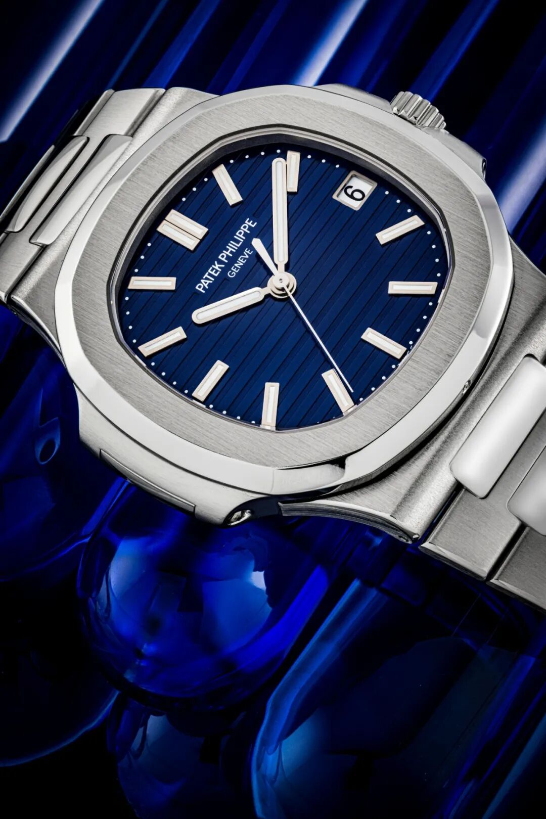 在外形上,铂金版本与精钢版本的表盘设计十分相似,仔细看则可见铂金版本的蓝色更显亮丽。此外,表盘3点钟位置设有带框日期视窗,「Patek Philippe」和「Geneve」字样在印在平面上,而非以惯常方式印在罗纹图案上。