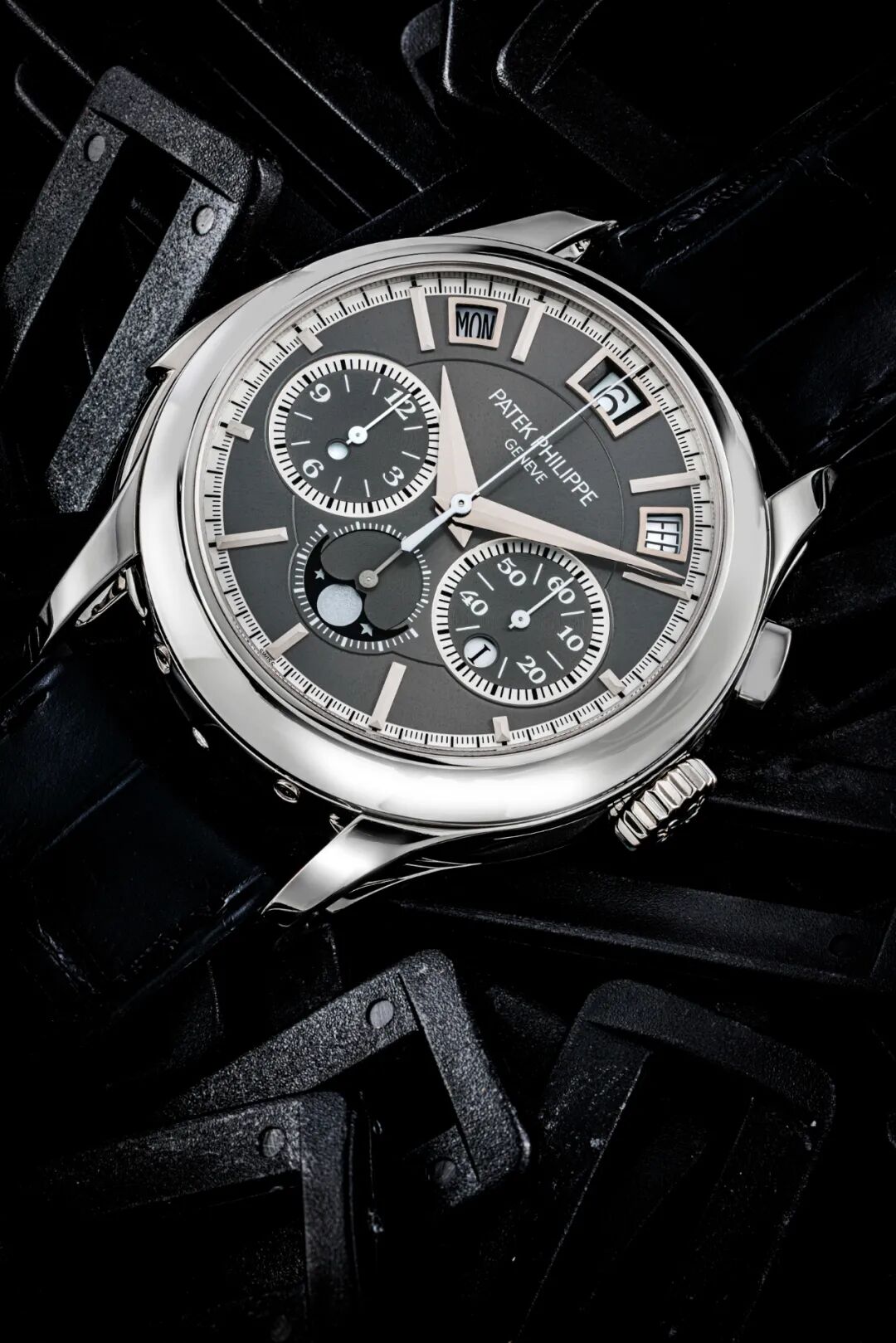 百达翡丽(Patek Philippe)Ref. 5004J-017,18K 金追针计时万年历腕表,配月相,24 小时,闰年显示,黑色带签名表盘,夜光时标及测速圈