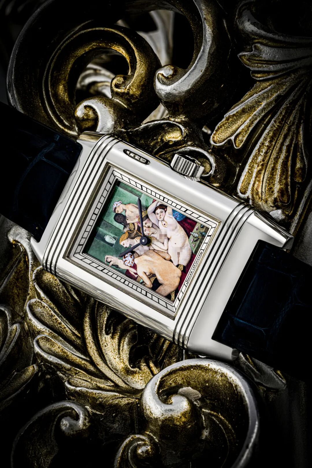 透过珐琅表盘展现匠人极致工艺的钟表品牌不只得PP,还有同样来自瑞士积家(Jaeger-Lecoultre)。今回举槌的Reverso À Eclipses裸女名画(Famous Nudes)系列铂金可翻转腕表,积家于自家工房以「大明火」珐琅技术,在表盘绘上法国十九世纪画家安格尔名作《土耳其浴》,充满古典气息。