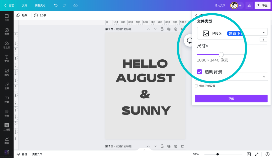 新建一段文字,输入文字内容,调整好字体和颜色,点击【下载】-【导出】,得到PNG透明背景的文字素材备用。