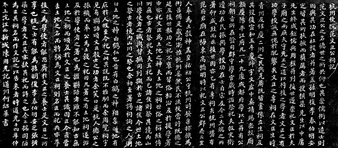 第一件,《杭州使院范文正公祠记》拓本,纵二十三厘米,宽五十二厘米,书于道光十四年,作者三十六岁或稍晚,江西新城陈用光记,临平吕伟刚藏。这件作品有一个非常有意思的背景,陈用光撰文于道光十三年仲冬,时任浙江学使,这一年也是他接任何绍基父亲何凌汉浙江学使一职的第二年。陈用光利用原杭州百姓自发来学使署中祭祀范仲淹的习俗,重新整治修葺设立了正式的范文正公祠,以倡导杭垣百姓思齐范氏名德。从何绍基角度来看,他书写这篇祠记,是与父亲的后任的一次有特殊意义的合作。这里也曾是正当力学之年的何绍基随父宦居客杭之所,杭州给他留下了深刻而美好的第一印象。这里也是其恩师阮元为浙江学使时的署地,阮元《定香亭笔记》中的定香亭,即在署中,它的位置在吴山北麓,即今杭州四中校区内。何绍基上一年《跋晏云唐大字麻姑山仙坛记双钩本》即成于此,署曰:“道光癸巳春仲,识于杭州定香亭。”书写这篇与自己有那么多因缘的祠记,何氏字里行间透射出严谨与精纯,除了深湛的颜字功力之外,还有一份特殊的恭敬与感怀。