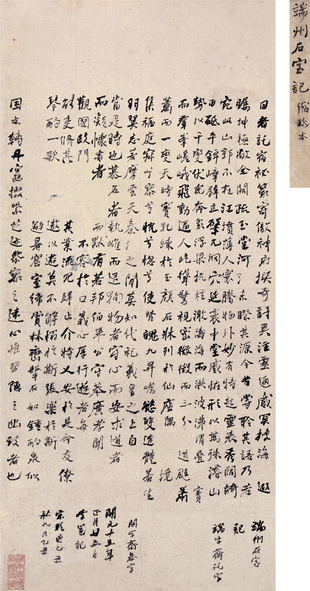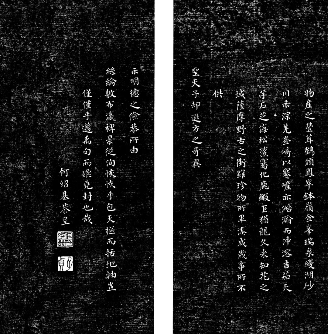 另一件是何绍基撰并书的《册封琉球赋》拓本,道光十七年,作者三十九岁,萧山钟妙明藏。何绍基应命为颂扬清代第七次册封琉球国王大典而作,他深知文翰事关清朝政府对外交往,切不可草率敷衍。这一点,在他的另外一个墨迹本后记中也可以见出:“……以命题。基撰是赋,师甚赏之。越戊戌春,两使者既陛辞,勿村索写赋赠行。自念词翰俱止此,倘携入行箧,则球阳文采之邦,得无为其所笑耶?道州何绍基并记。”