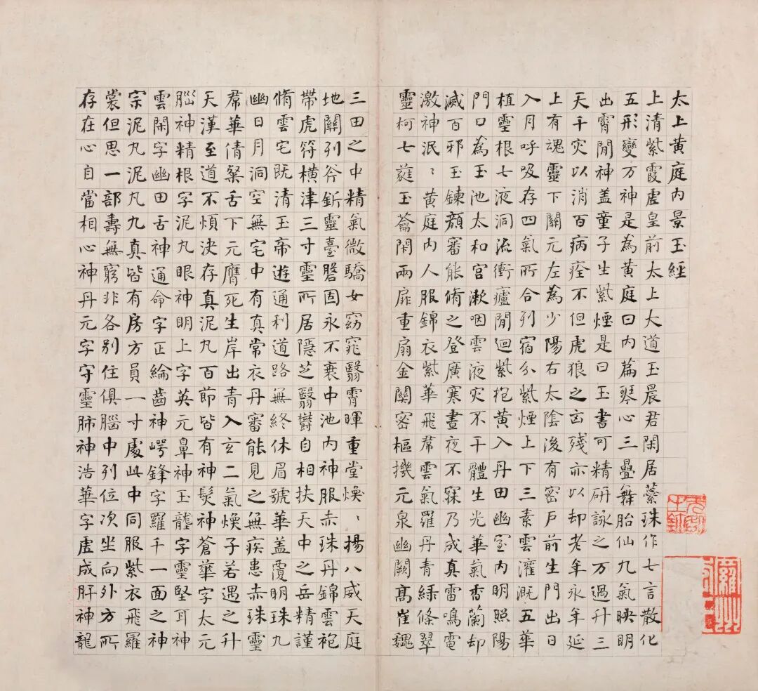 何氏一生以颜真卿为根柢,这两件是目前能见到的何氏书迹中比较早的纯用颜法的楷书作品,而且都是庄严的实用书写,颇得颜真卿《小字麻姑仙坛记》之韵致。