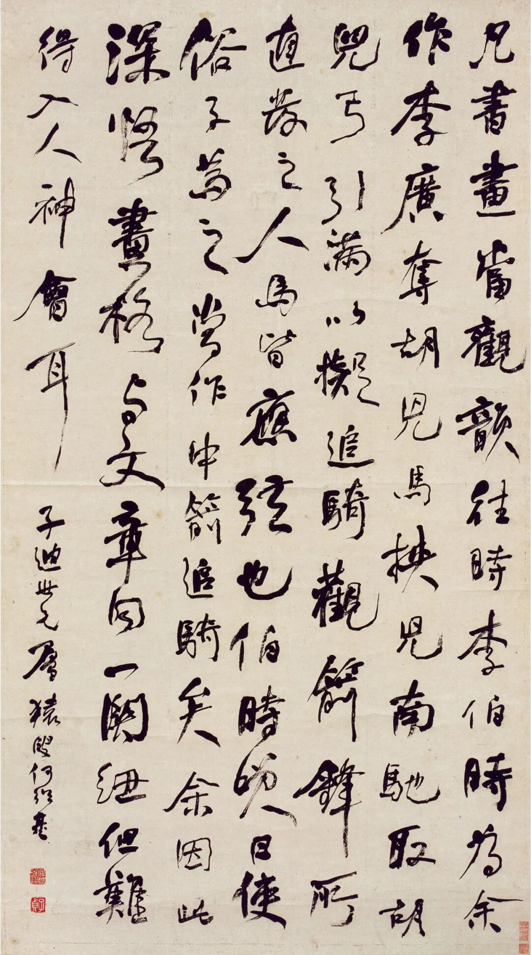 何绍基有一个标志性的书法创作形象,就是他“回腕悬臂”的执笔方法,因此他自称为“猿臂翁”“猿叟”等。“猿臂”典出《汉书·李广传》,李广“世世受射”,出身于传授射技的世家。他手臂特别长,善射成为他的天赋本能,所以后人或以“猿臂将军”称之。整个《李广传》,都是围绕他猿臂引弓、骁勇善射而展开,几次重要的征战获胜,几次从陷落敌阵的困顿中成功突围,都靠了他猿臂满引、攻守两宜的射技。从李广几次交战实例可以看出,他习惯拉满弓,有几个好处。一是射程远、力度大,所以能“见草中石,以为虎而射之,中石没矢”;二是瞄准精确、命中率高,“见敌,非在数十步之内,度不中不发,发即应弦而倒”;三是他尝令“持满毋发”,八面受敌,攻守自如,进退无碍。因此“猿臂”是技法稳练驾驭自如、无论遐迩志在必得的象征。