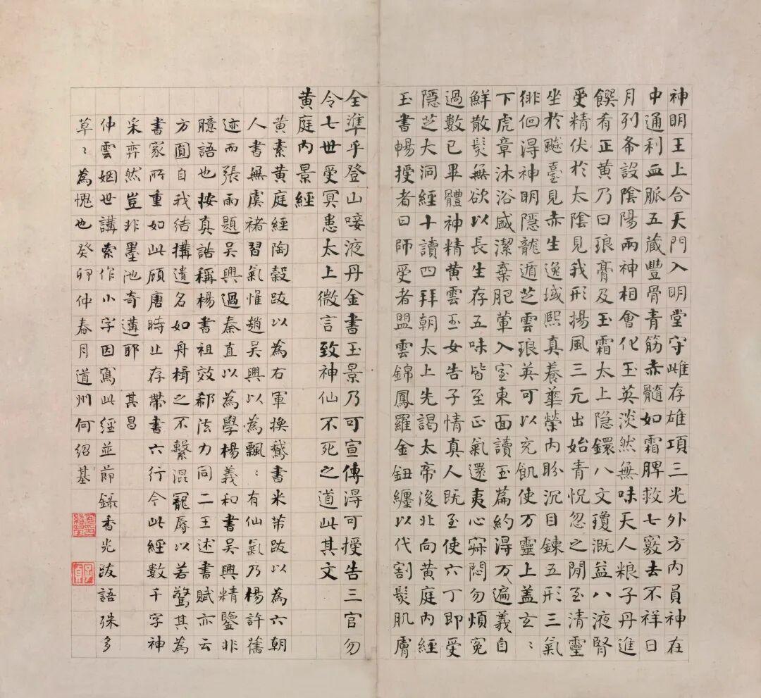 何氏一生真行书专攻颜真卿,兼法欧阳通、李邕,万里天涯间《张黑女》不离行箧,六十岁以后又遍临汉隶名碑。他的精勤学古,业已成为书林佳话,广为人知。此处举出难得一见的何氏两件早年颜体端楷,以证其早年不凡的颜楷功力。