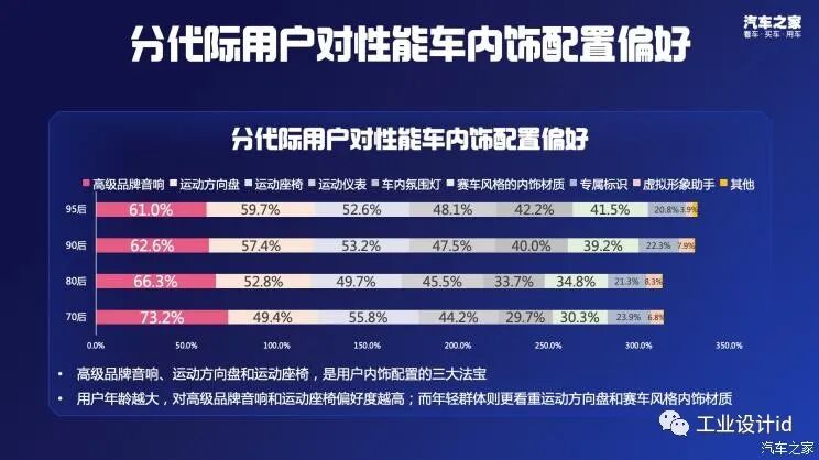 同样针对性能车的分析:年轻人对于外观套件的购买意愿最强烈;在内饰的设计和配置方面,音响、方向盘和座椅三项最受欢迎,而且越是年长用户,对音响更关注,年轻人则更注重方向盘和赛车风格材质这样表达视觉的设计。