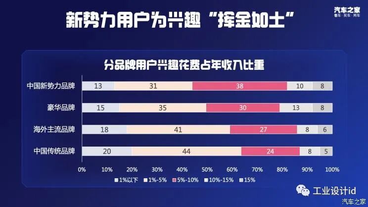 在不同类别品牌的用户在兴趣方面的花费,数据分析显示:中国新势力品牌用户兴趣花费占年收入比重达38%,豪华品牌用户此类占比为30%,中国传统品牌用户在兴趣方面的花费不足25%,可以见得,新势力用户可谓为兴趣“挥金如土”。