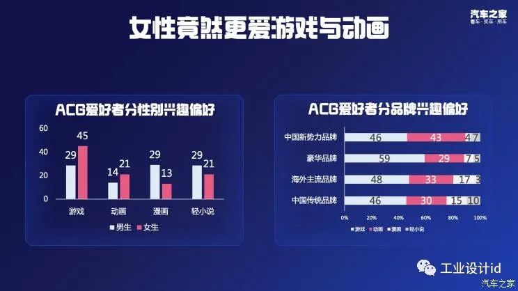 除此之外,对于小众兴趣ACG方面进行的分析,得到的数据结论是:女性对游戏和动画的偏好竟然高于男性;而中国新势力品牌是最喜欢动画的群体,程度远超其它类别。