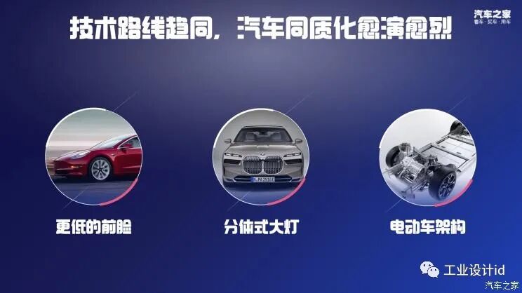 问题是,即便大多数车企都始终在竭力避免 “同归于尽”的竞争模式,到了目前,技术路线的高度趋同,还是导致汽车产品同质化越来越严重,内卷由此加剧。例如为了降低风阻,车头线条下沉设计,还有LED技术进步和线路优化,推动了分体式大灯的流行,再到纯电动车的简洁架构。