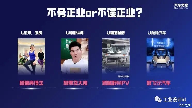 看似不务正业,实则是“不误正业”的圈层和群体越来越多,如从歌手演员到爆红健身博主的刘耕宏,从培训机构讲师到直播间带货明星主播董宇辉。在汽车圈,同样有诸如此类的“搞怪动作”,比如长城汽车将基于坦克平台打造越野MPV,也就是俗称的越野面包车;还有另一边的小鹏汽车,直接出了飞行汽车。