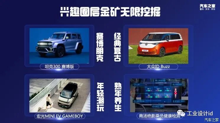 风险总在绝境处,这样的险境中我们依然看到了机会。兴趣圈层金矿可以无限挖掘。在用户画像年龄偏高的硬派越野市场中,坦克300用赛博版,圈出了一个热衷于赛博朋克主题的游戏和科幻爱好者群体。宏光MINI EV GAMEBOY,为囊中羞涩的年轻人也提供了一个年轻潮玩的标签,哪怕是只买普通版MINI EV的用户。大众ID.Buzz是为精神嬉皮士准备的复古情怀。乘员健康检测智能座舱,就是一道为熟年族准备的健康保障,也是养生文化。
