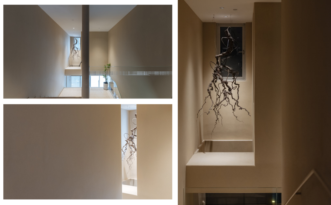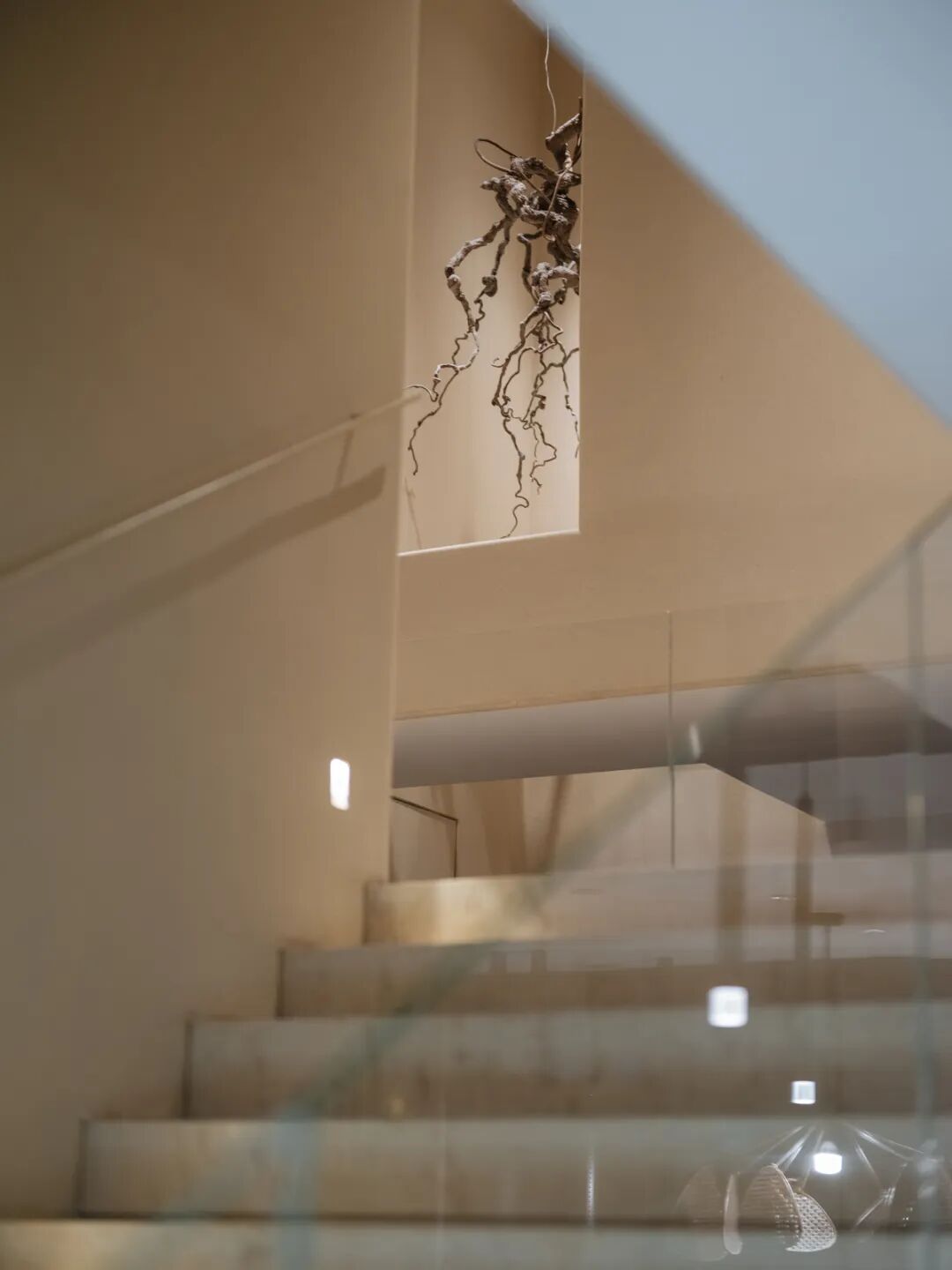 入口连廊是个沉静的地方,尽头是迎宾处和二楼的楼梯,自然成景。