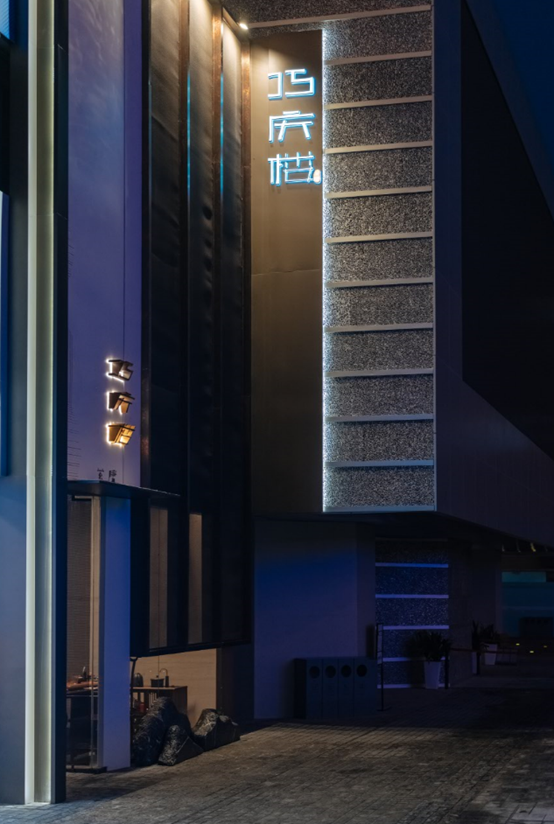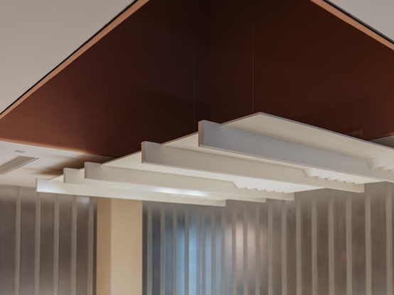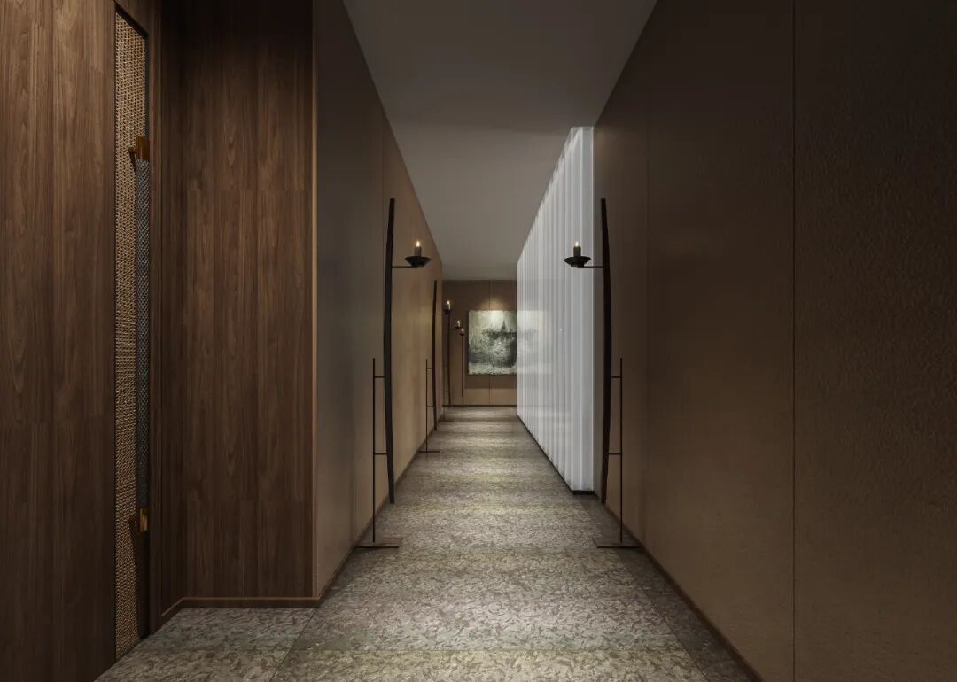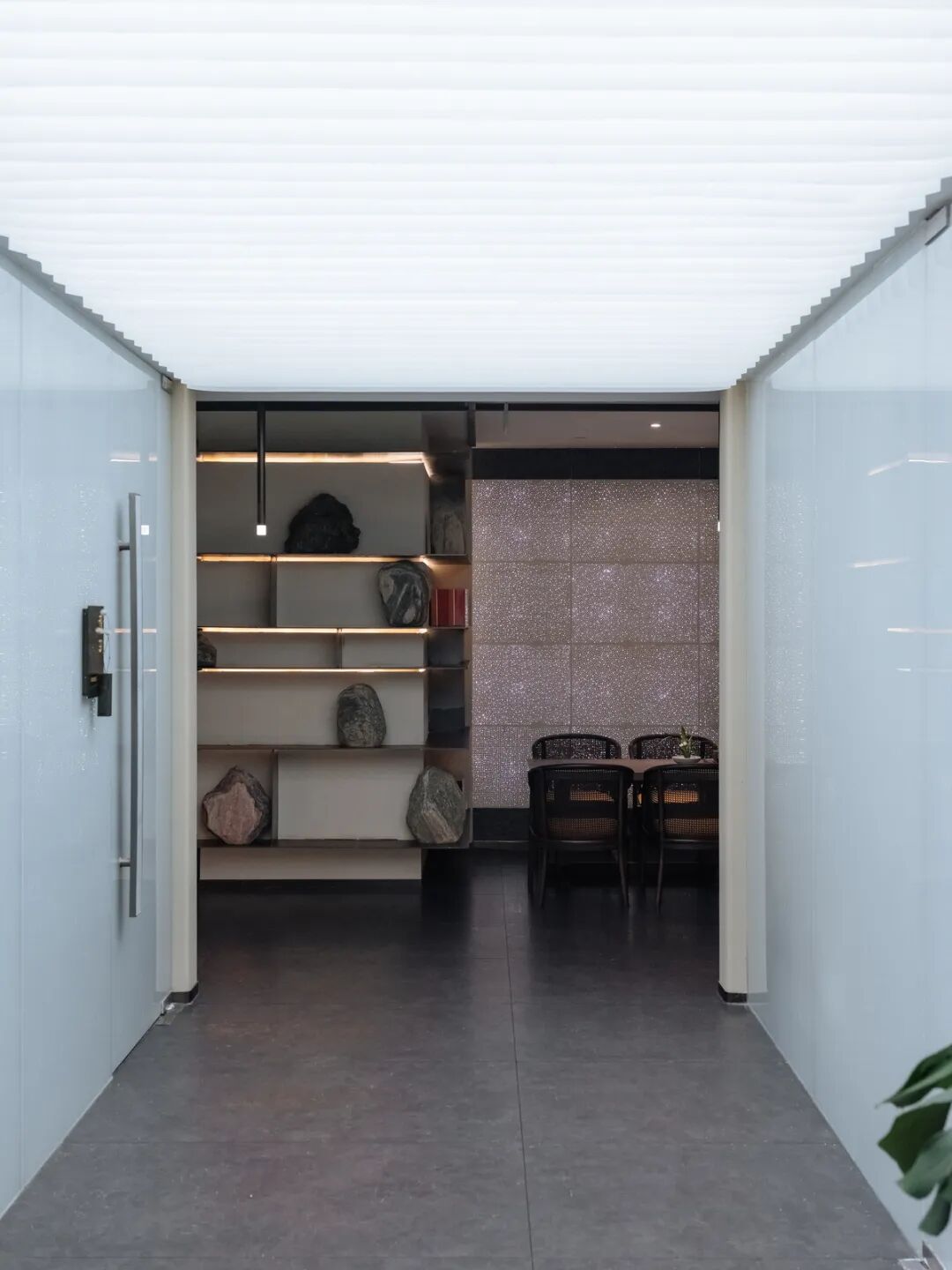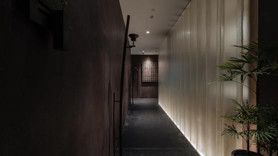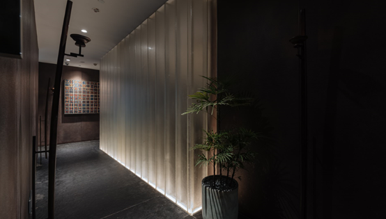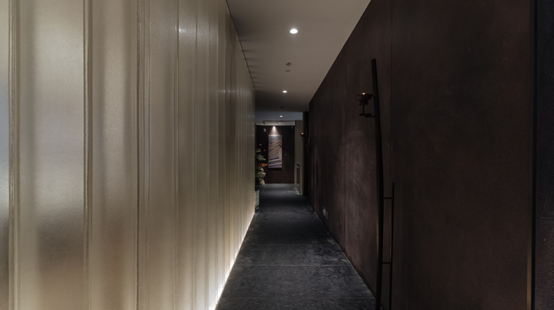 二楼过道,半透明材质和灯光的配合,营造出简易、雅静的氛围。这是设计团队对开放空间(外)与静谧空间(内)之间关系做的处理,由动向经的过渡。访客跟随灯光穿过谧静的走廊与美食相遇。