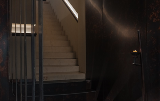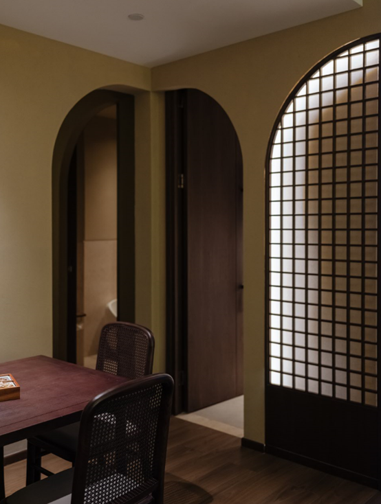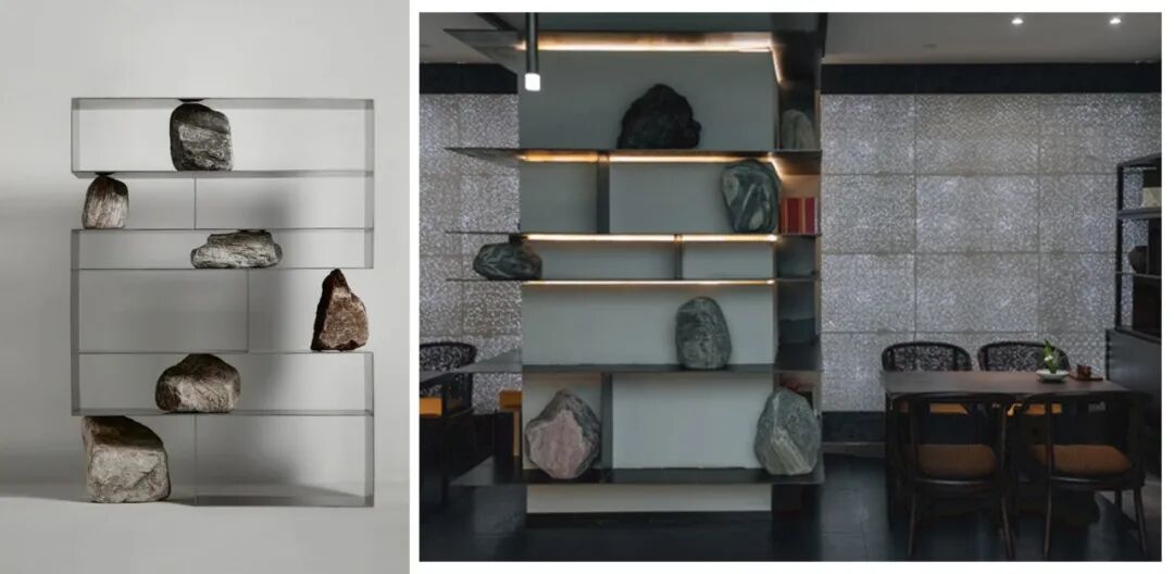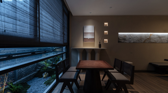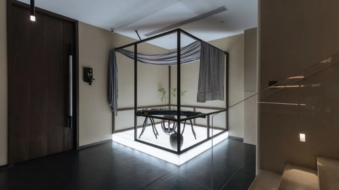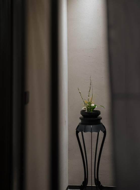 优雅闲静的氛围感从“侘”而来,有情之物不必说,无情之物如草木、道具摆设之类,各有各的本情,与人情并无不同。达不到“本情”的人,面对风花雪月也会无动于衷,设计团队意在虚实互用,将二楼的楼梯打造成有与无的关系,现实与想象的关系。