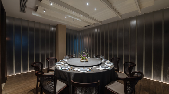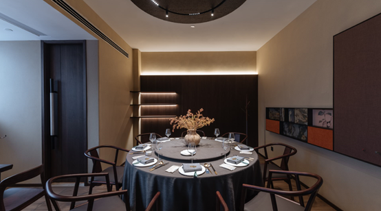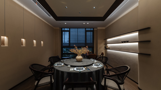 两宋士人尚雅集宴饮,典雅精致。饮食讲究意趣,简餐素食体现出一蕇食一瓢饮的安稳清欢。设计团队将宋代美学的色彩在包间中依次呈现。主色调以中、低纯度为主,将棕黄、蓝绿、粉青、灰蓝、月白、灰青以点缀的方式安置在小区域,整体表现的是优雅的意境。