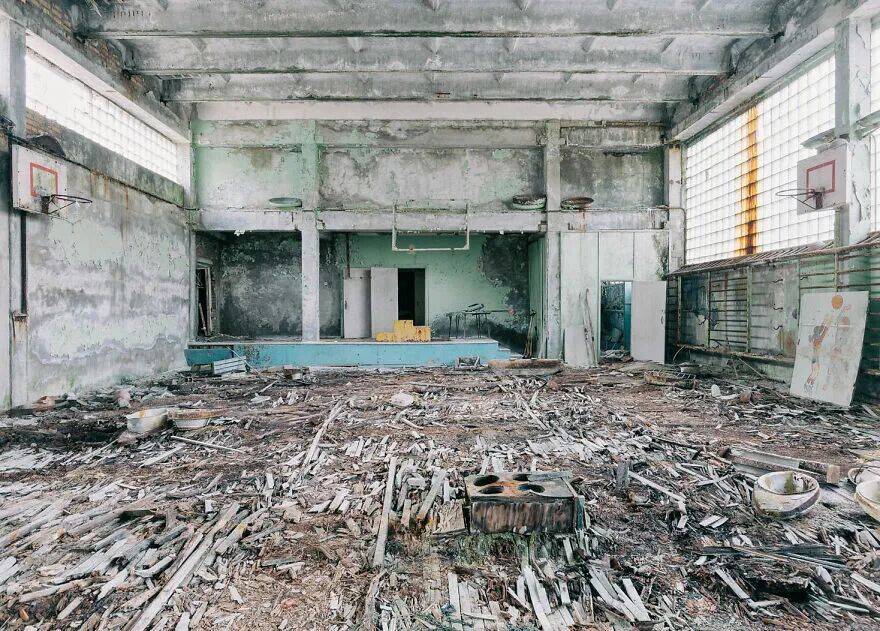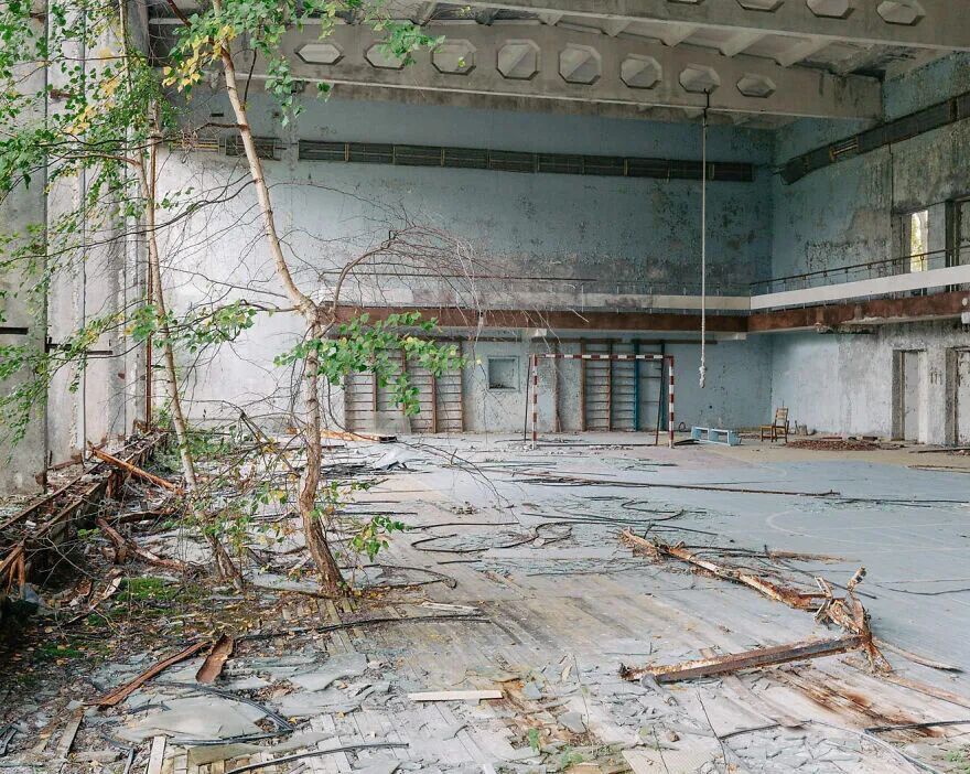 这张照片显示了当地的一个体育馆,在这里,自然也在重新获得应有的地位,树木从橡木地板中萌芽。